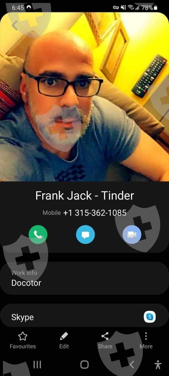 请小心这个爱情骗子Frank Jack (Jakki) whatsapp#, (315) 362-1085, 电子邮件 frank1765@gmail.com 或 jackk8292@gmail.com。他是一个健谈的人,总是要钱来进行一项号称一周内能让投资翻倍的投资。他会告诉你外汇交易商是注册的,但他不是。一个名为 Price Markets 的不受监管的外汇交易商,他使用电子邮件地址 jacobkk231@yahoo.com。没有电话号码或公司网站。仅通过电子邮件与 Kimmuch 先生沟通。Frank说投资很低调,不想打广告。如果你认识这个自称来自纽约市的人,请不要相信他的故事、虚假承诺和谎言。他正在推广的最新投资提供了比原始投资更高的回报。太好了,这可能是真的。他说他的生日是 1971 年 4 月 18 日,当我拿到他的驾照时,上面写着 1972 年 6 月 3 日。又是一个谎言。