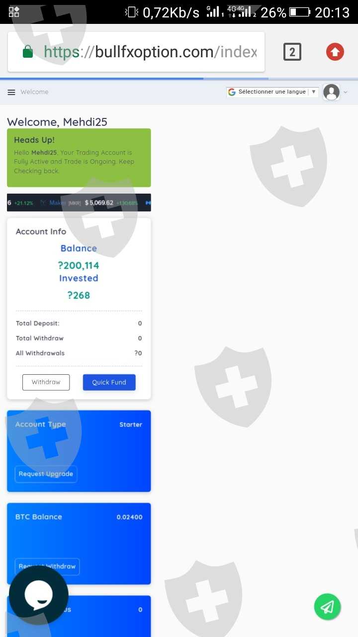 自 2018 年以来我在这个网站 Bullfxoption.com 上投资了 0.024 比特币,现在我有 200114 美元。但是网站说必须存入交易费用才能提取资金,以下是网站和个人资料的屏幕截图。