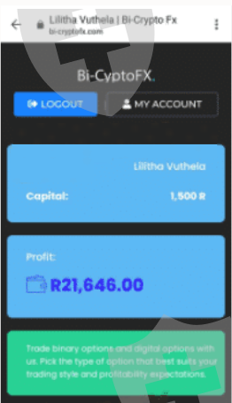 I made an investment of R1500 to Bi-cryptofx and they said the profit is 21000... Then when it was time to withdraw they wanted a withdrawal fee where the fee to higher than my capital and plus profit!!!
