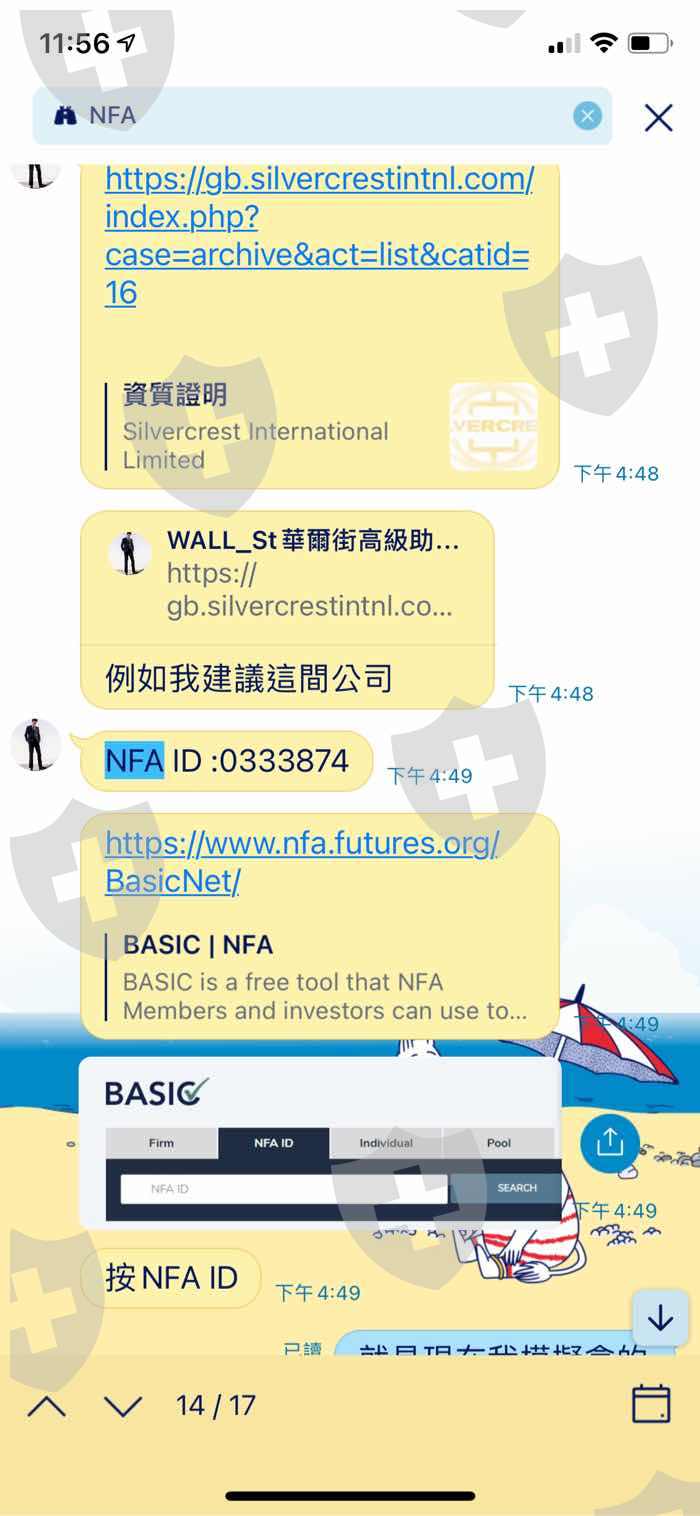 2020年11月在奇摩廣告頁面加了華爾街線上投資顧問公司的會員,接洽我的窗口是張天生張助理,他推薦Silvercrest這個交易平台並聲稱有經NFA的監管,提供監管ID:0333874有詢問NFA是否監管事實,卻得到NFA回覆我此平台沒有監管權限,於是我提出出金申請卻被平台拒絕並凍結,在多次調解後恢復倉位運作,因被凍結過我也不敢輕舉妄動打算操作一陣子再提出金要求,2021年8月3日我又鼓起向張助理提出想交付會員費及出金,張助理屢次表示在忙,當天操作ETH下一個交易單,出現30秒後重複下單的狀況,隨即爆倉,反應客服與張先生這狀況都沒有協助解決,直到我提出要請網路警察調查下單IP後,交易商與張先生就再也聯繫不上了!