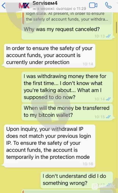 我在该平台开户并存了200 美元,赚了300 美元的利润,第二次他们让我存3000美元,但我申请出金一直失败。我被告知因为更改了提款 IP 地址,我的帐户暂时受到保护,要存入 4,500 美元来移除保护系统。随后骗子又让我付押金,我才发现被骗了。