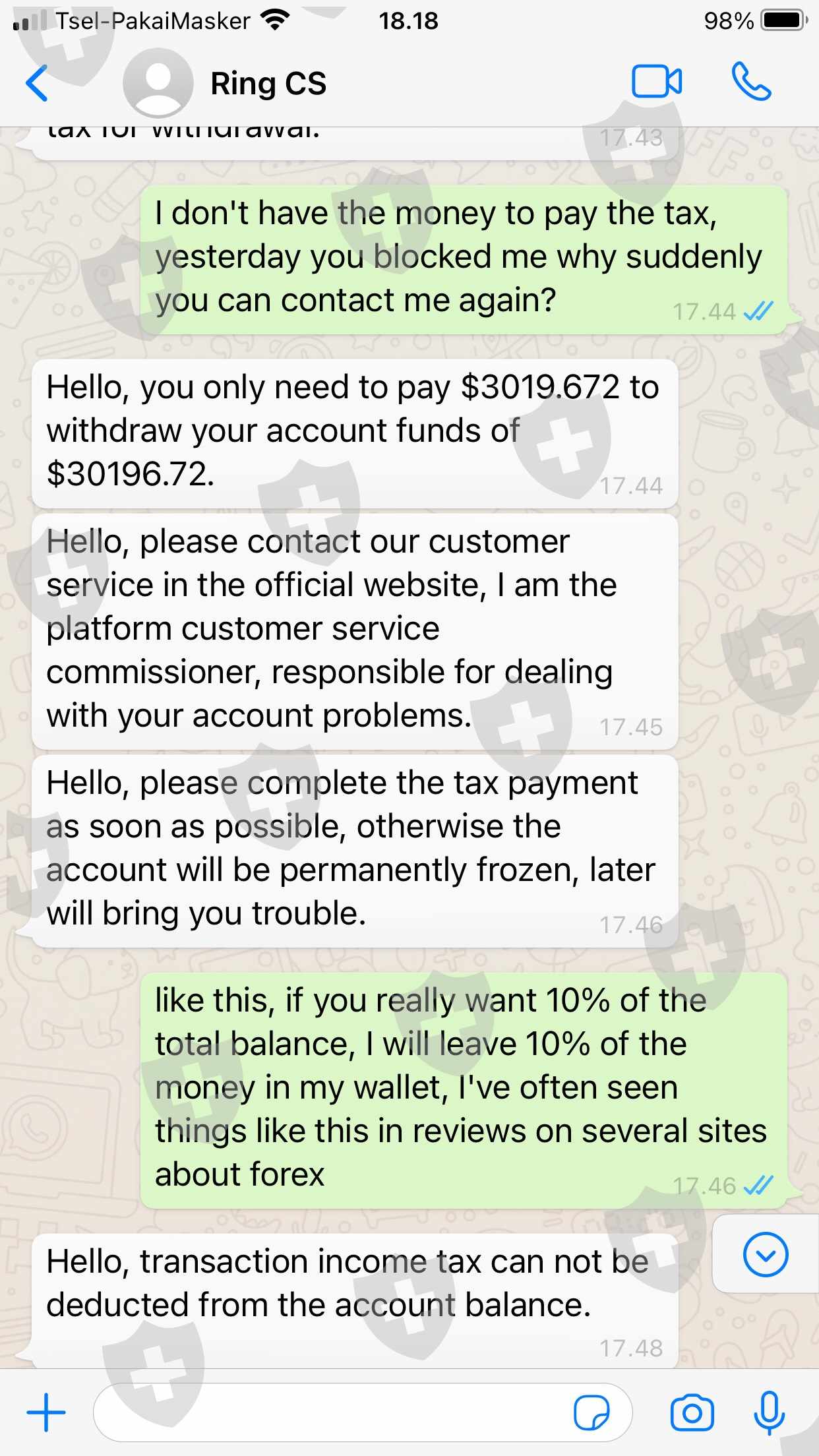 Pihak Ring financial limited telah menipu saya dengan cara saya membekukan saldo saya. mereka akan meminta 20% dari total saldo yang saya miliki dengan alasan pajak, setelah saya tidak memberikan apa yang mereka pinta, mereka tidak merespon email saya, komunikasi melalui whatsap juga di blokir. kembalikan semua uang saya, untuk yang mau invest di ring financial limited jauhi broker ini