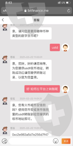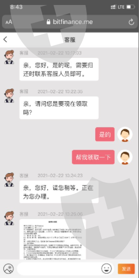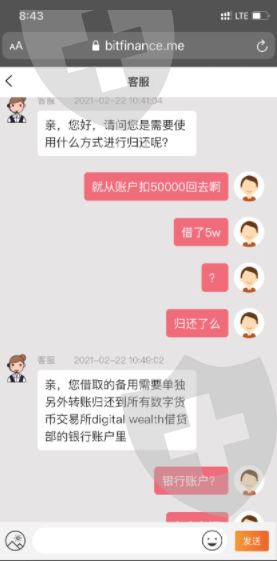 bit finance交易平台,今日客服提出实名认证后可借用备用金5万刀以用于交易,未说明相关条款便放出5万刀到我账户,并提供如下图的交易凭证。我看到后觉得有蹊跷便提出要立刻还款,客服却声称需要从外部转账过去还款,不能直接从平台还ustd,并冻结了我账户上所有的金额不允许提币。