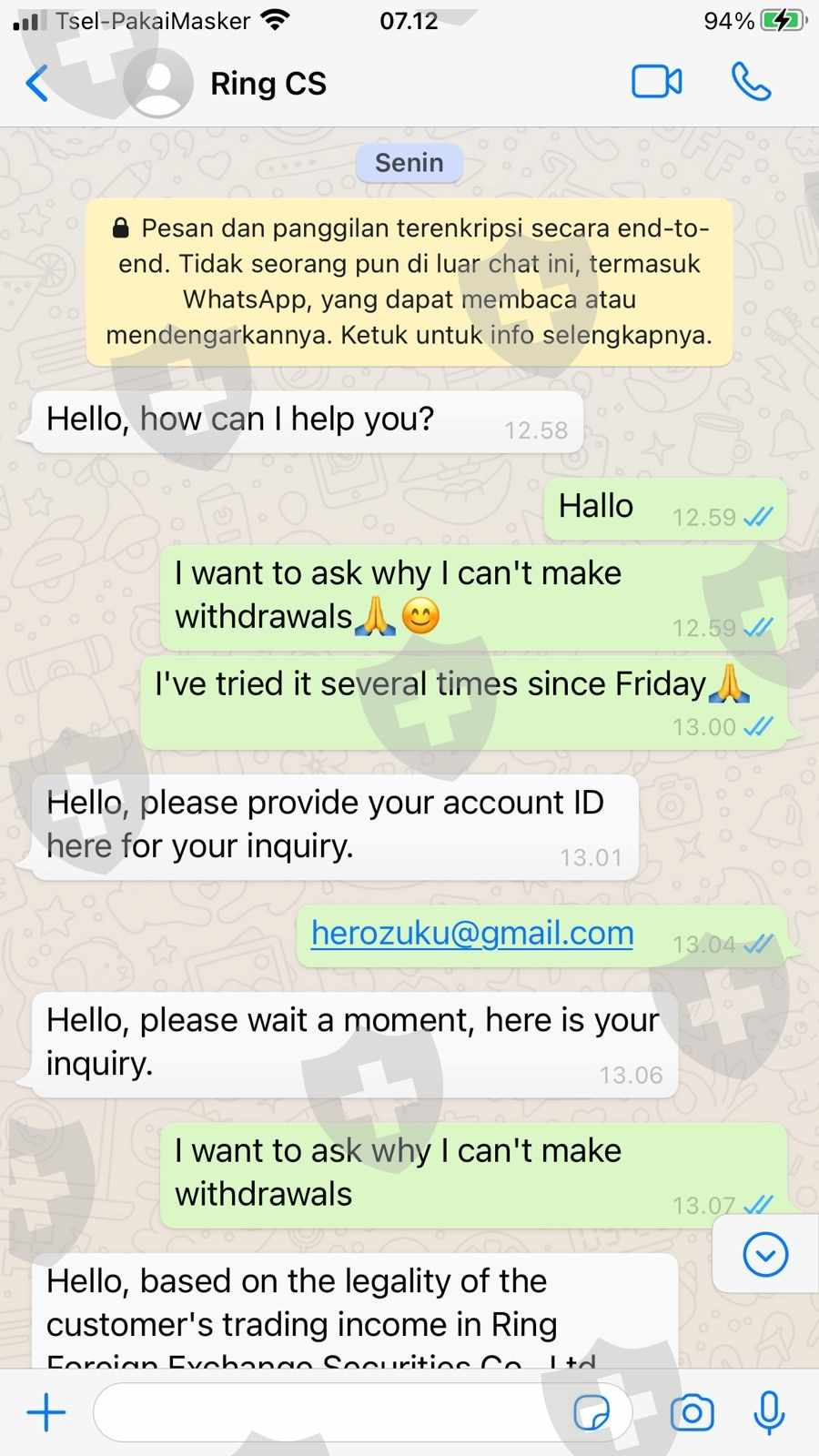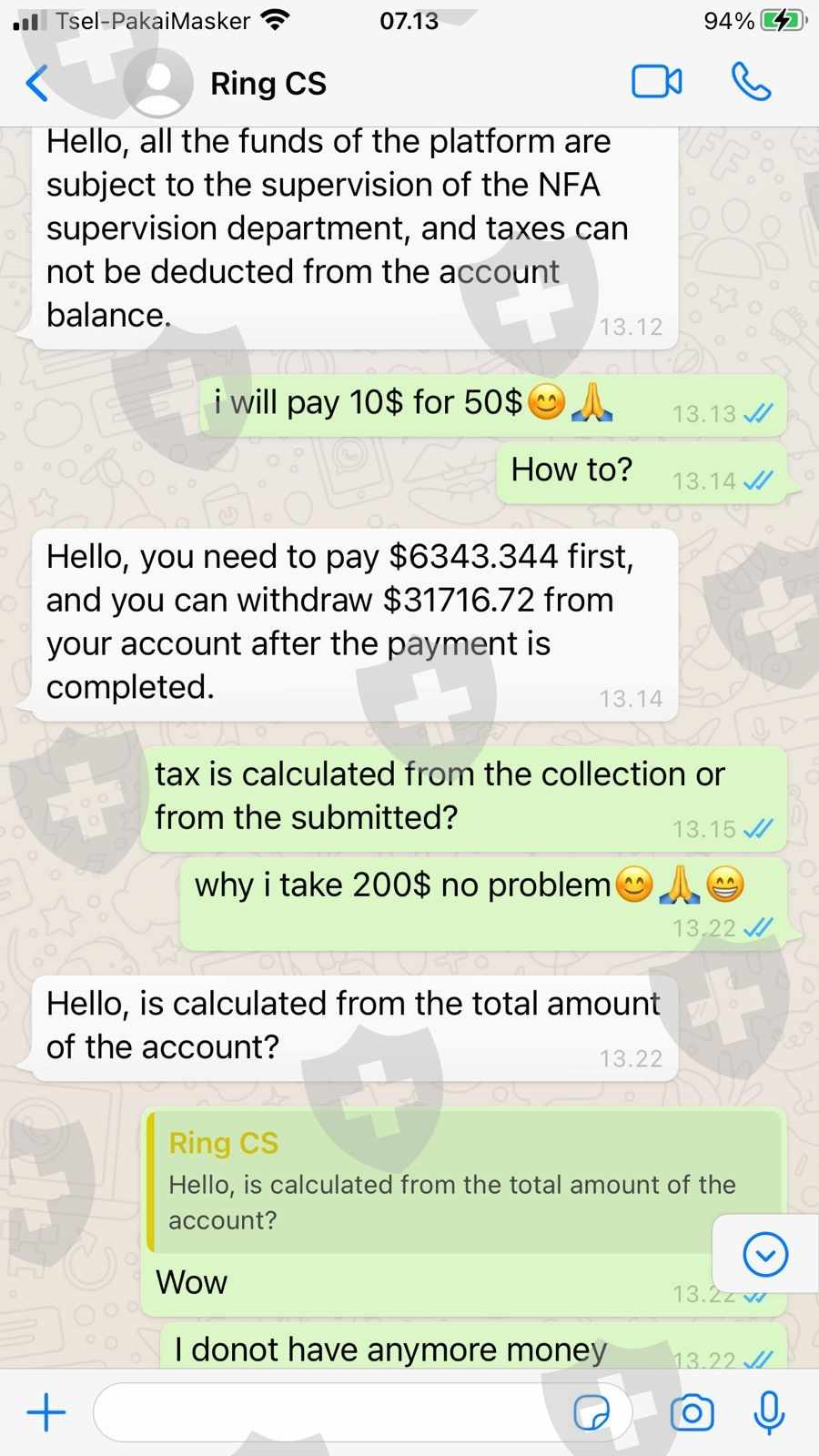 saya dikenakan pajak 20% dari total saldo yang saya miliki sebesar 30.097.34, itu hanya alasan untuk menahan uang saya. saya tidak dapat melakukan komunikasi dengan pihakRing Financial karena saya tidak membayar apa yang mereka inginkan. melakukan penarikan saldo saya, tolong kembalikan uang saya