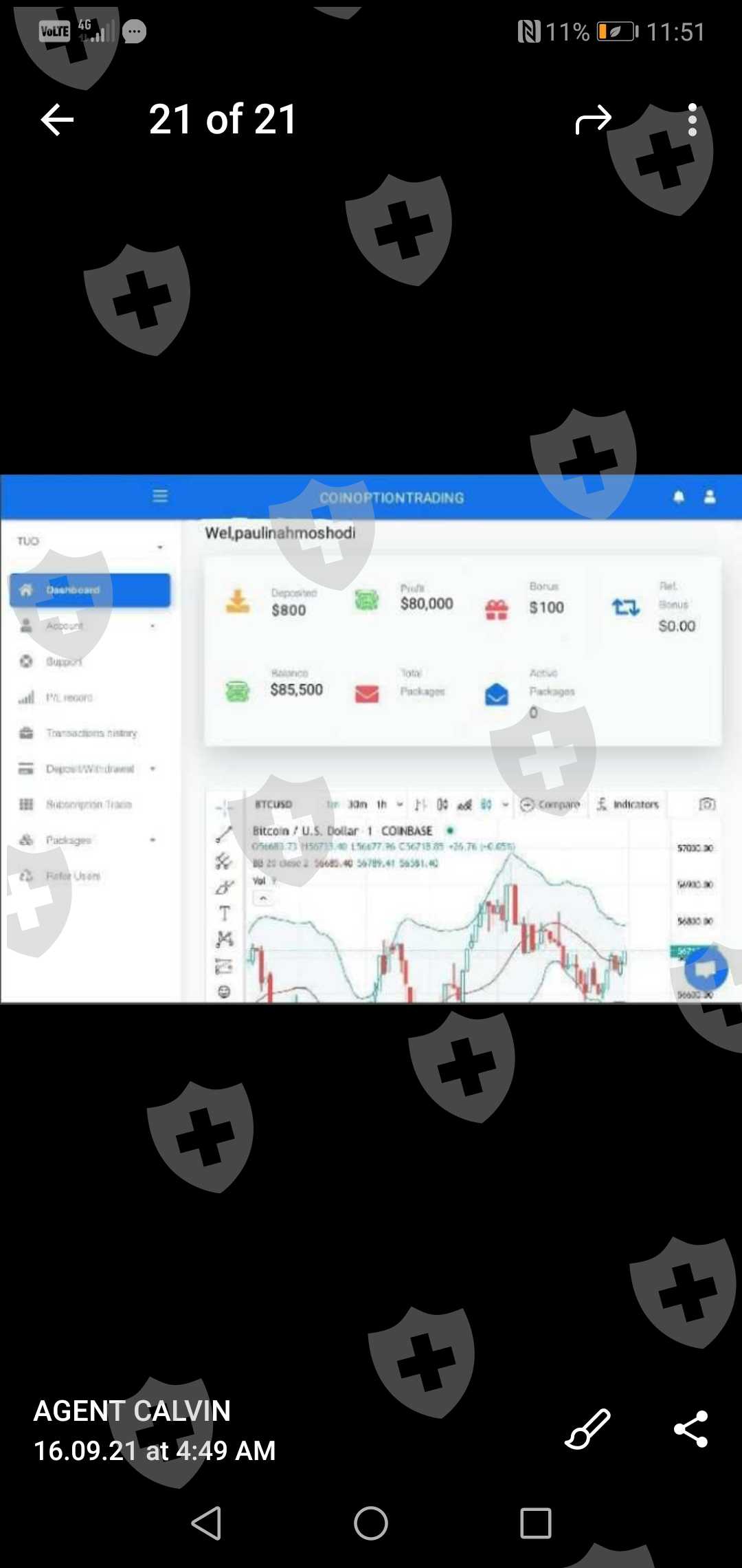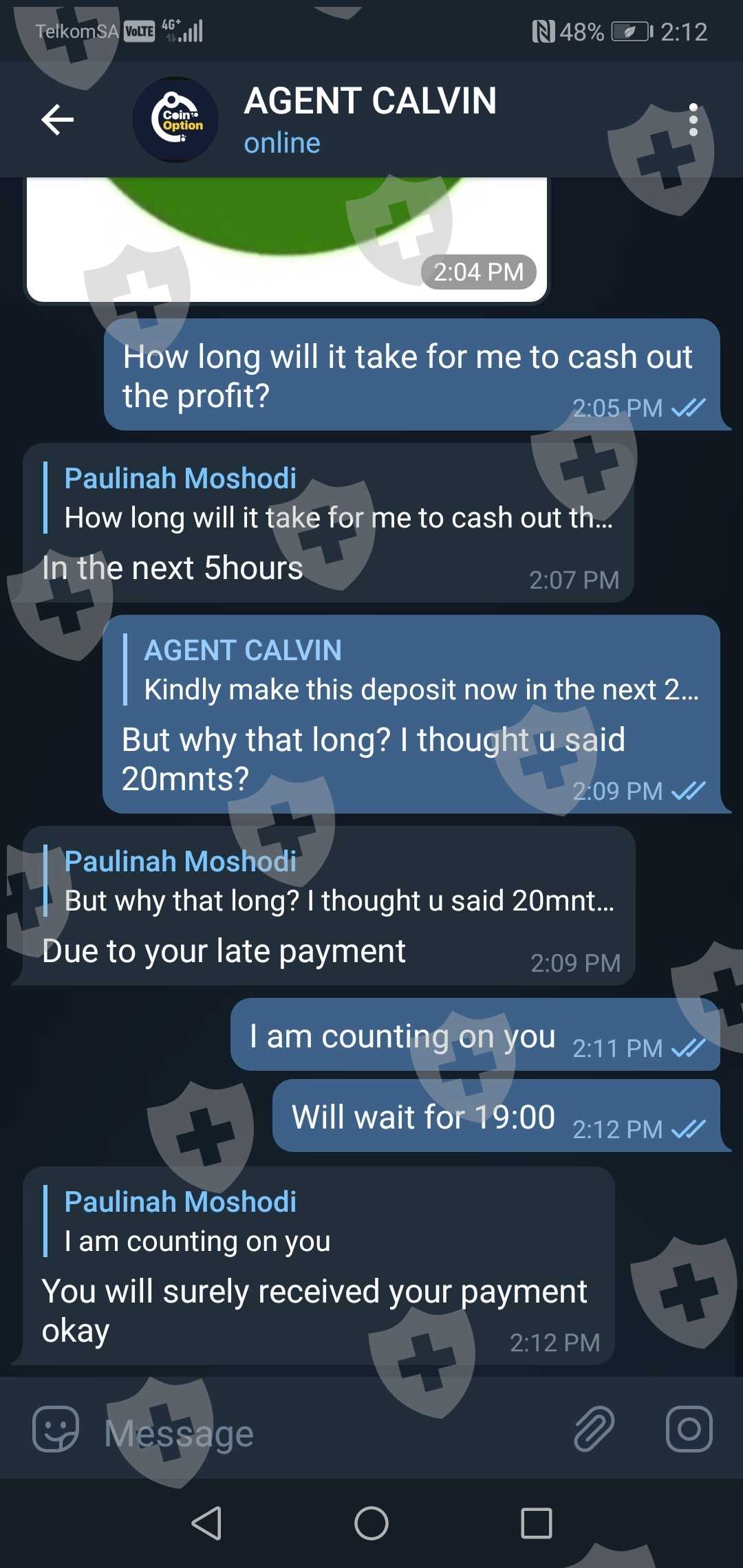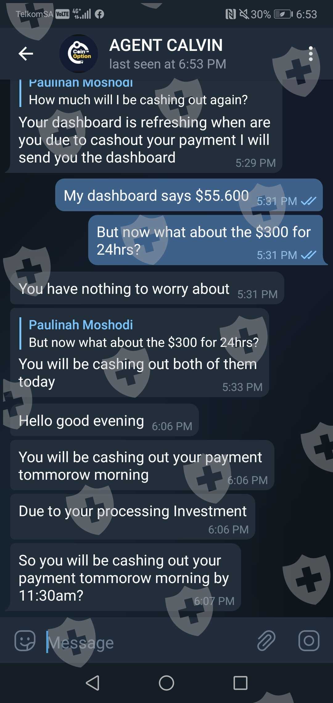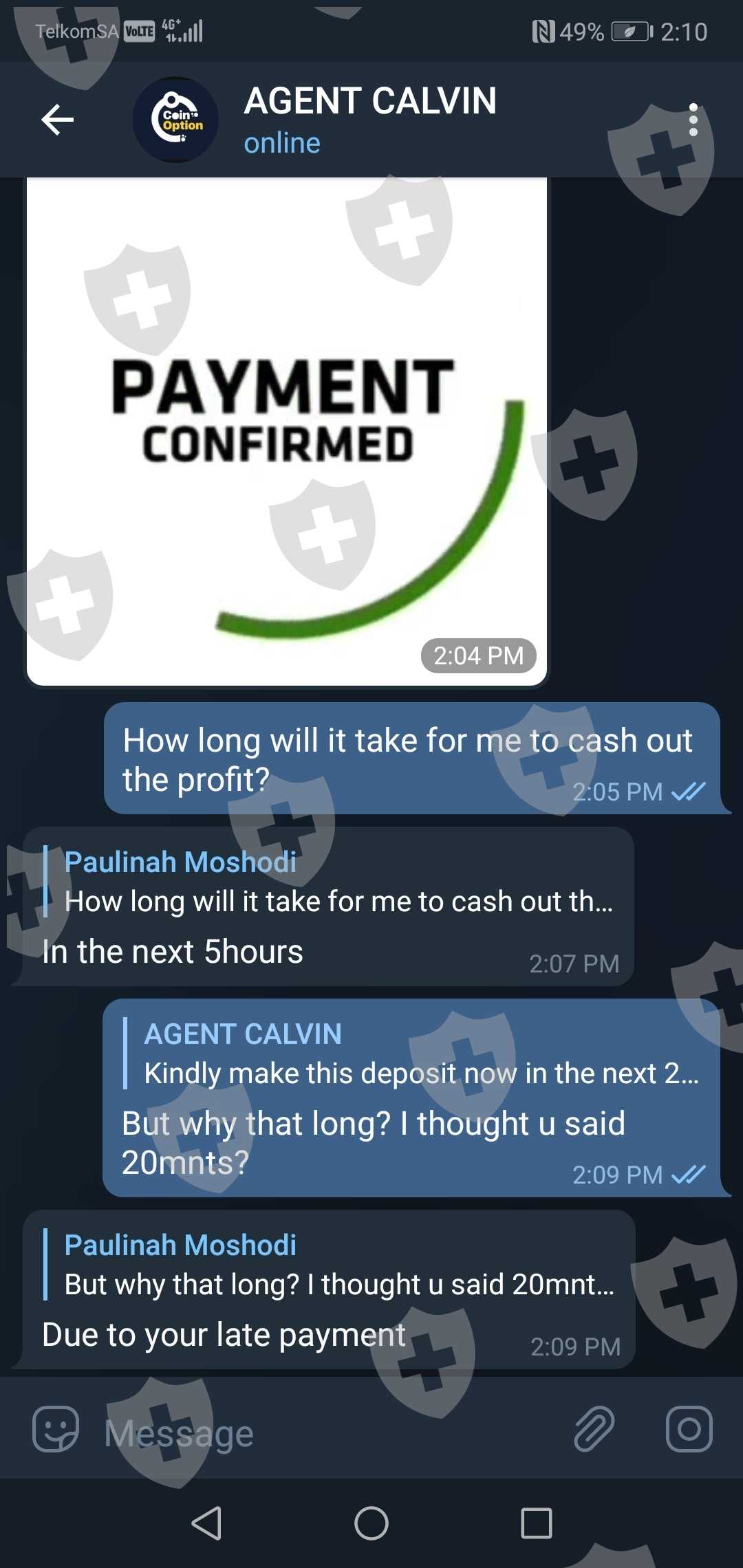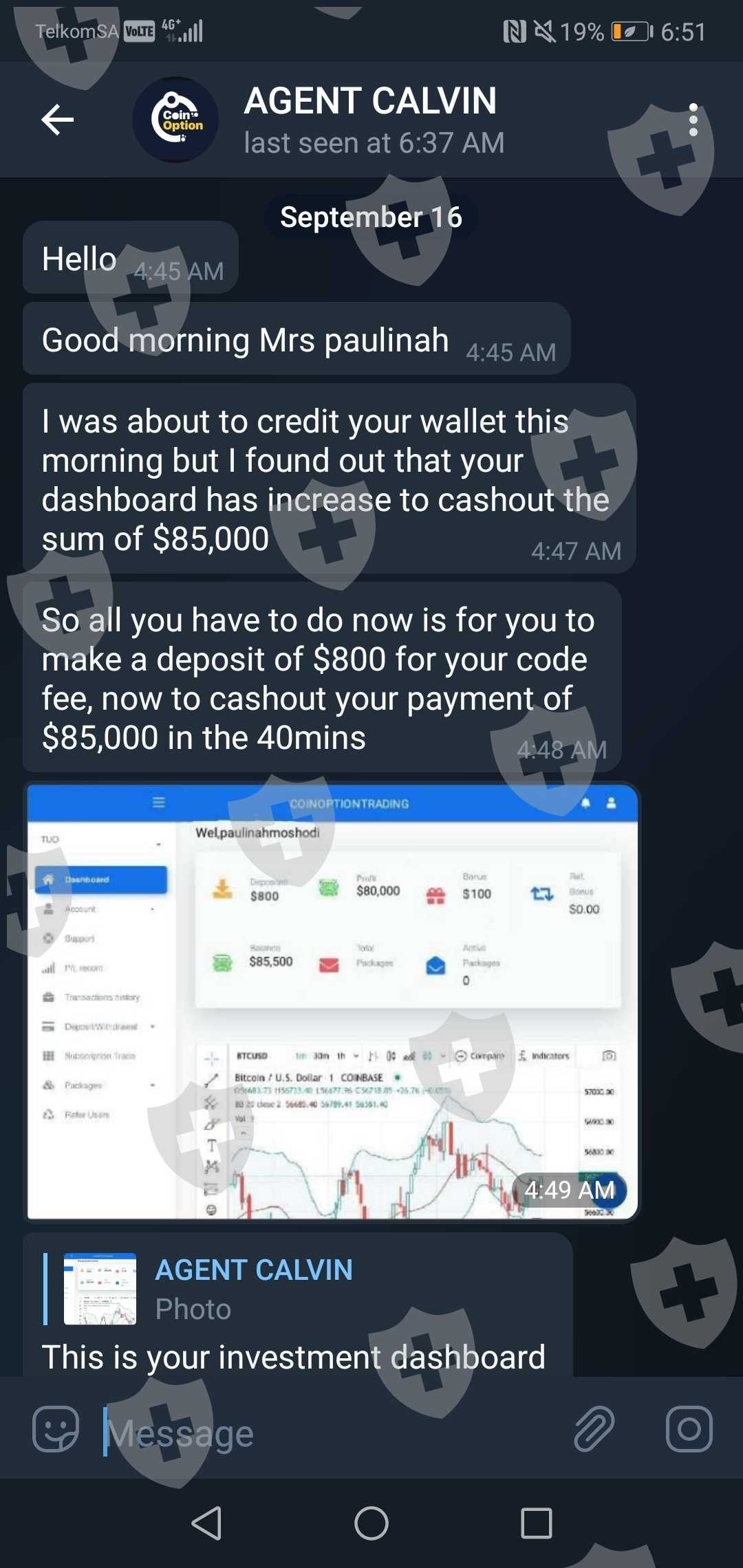Agent_Calvin of coin option trading company proved to me that they are scammers, I first invested $500 I was expecting to get a profit after 3days, he told me that I qualify for a 24hours promotion which I invested $300. When I have to cash out he told me to pay $800 as a withdrawal fee and cash out after 20mnts upon deposit, after I made that payment he told me to pay $500 as a activation fee after I paid it he still wants me to deposit $800 so I asked for my cash back which he told me he can't