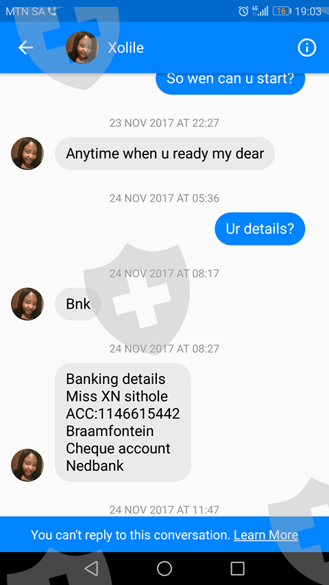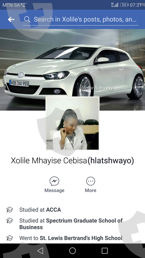我被这位女士骗走了我的钱。她不愿意还钱,所以要小心。她使用多个账户。1- xolile_ndoni 2- Xolile Cebisa Hlatshwayo3- Xolile Mhayise Cebisa (hlatshwayo)4- 霍普韦尔-乔布我直接向她的银行账户投资了R2800。她做比特币和外汇投资,也是外汇的导师。我也对她开了一个警察案件。在Facebook上,我只是想让其他人知道,这样他们就不会上这些骗子的当。