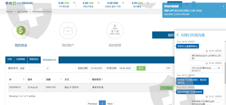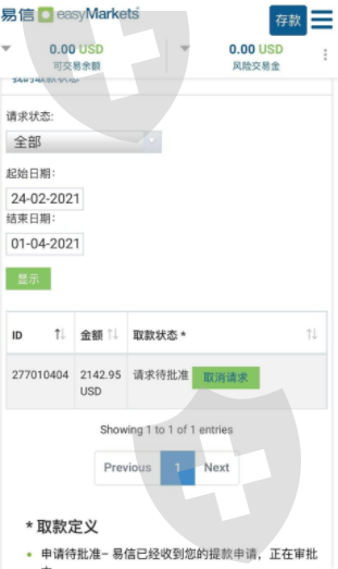 我在这个平台已经有一段时间了。可是上次当自己申请出金的时候,一直到现在也没给批准。从2月24日开始一直等待审核等到现在,而这期间, Easy Markets方面没有任何人员主动联系我。我能做的只有苦苦等待。而这一等,竟然等了一个多月直到今天, Easy Markets方仍然未联系我!