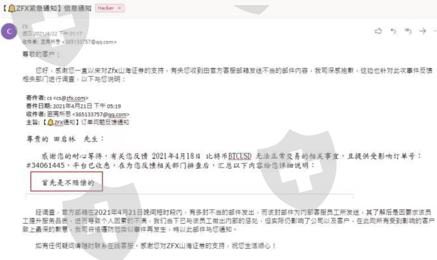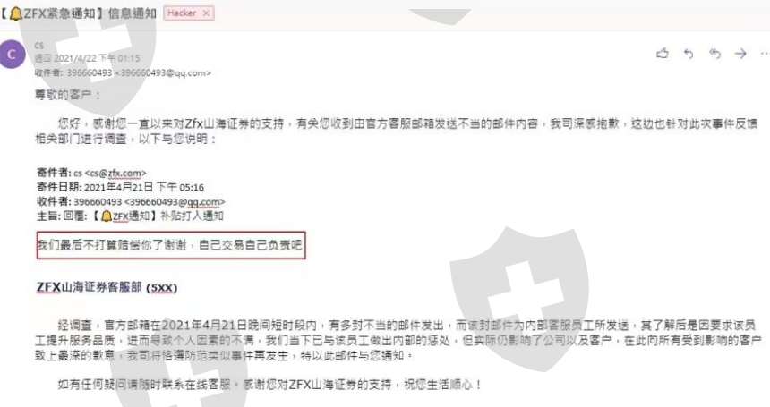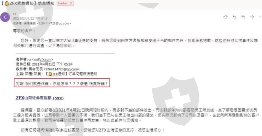 4月21日傍晚5点45分左右,我收到zfx大量不当邮件!从来没有看到那么没礼貌的客服!一定要曝光这种垃圾客服!花钱买难受