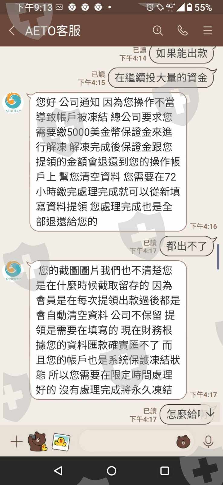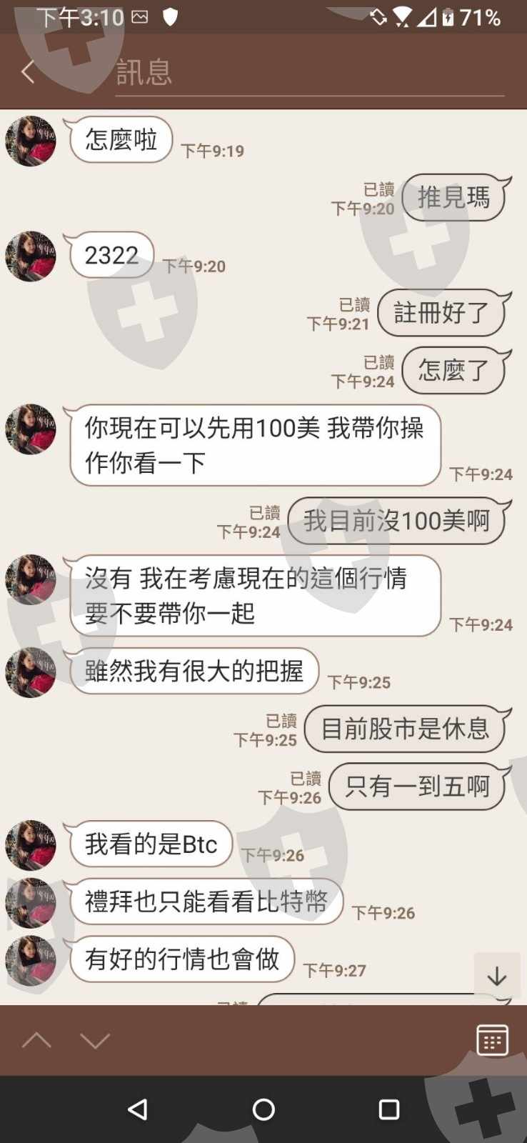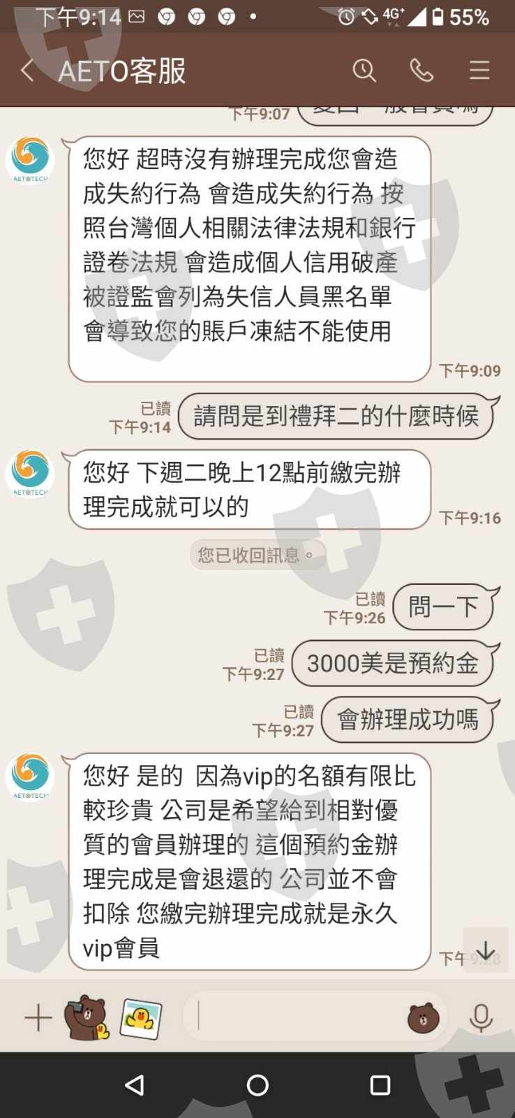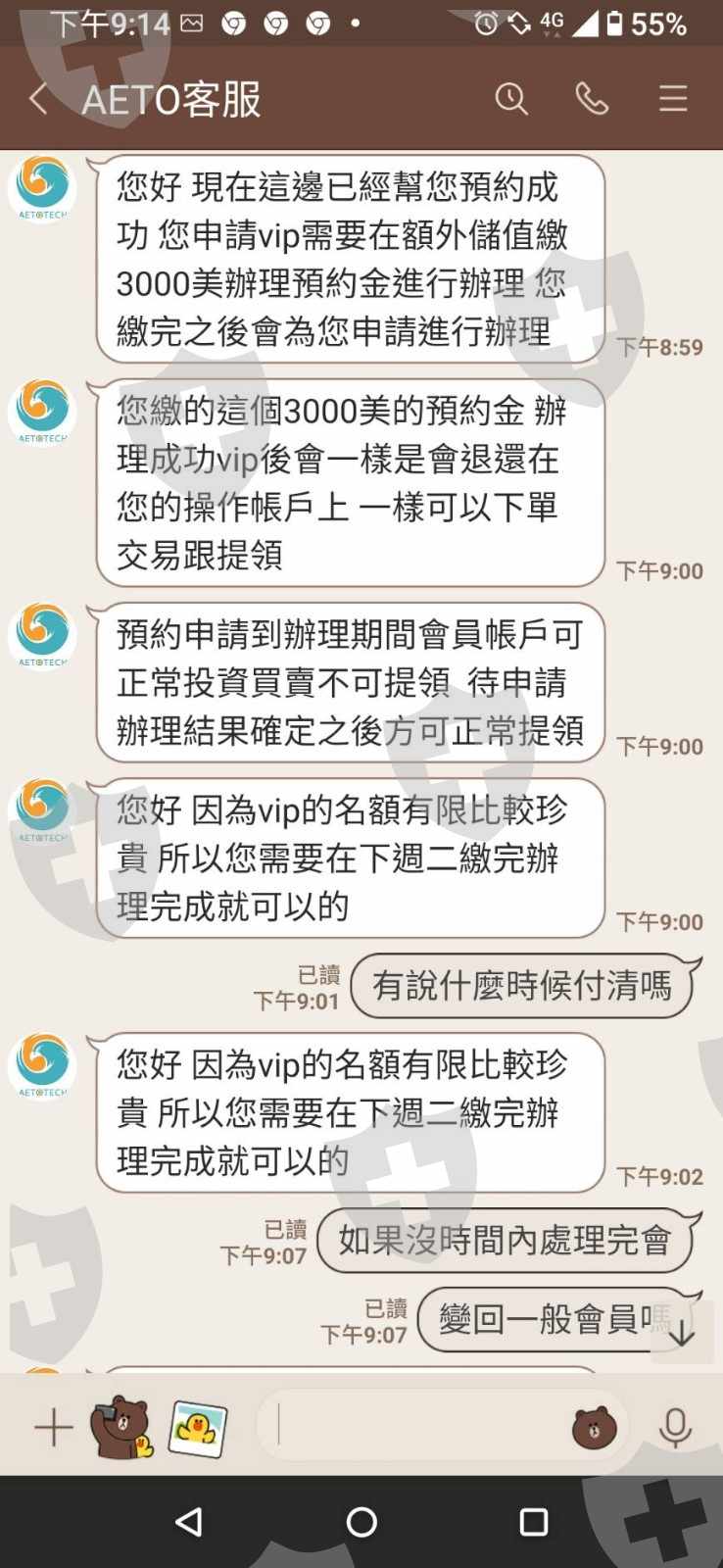 先用證照來消除我的疑慮,再騙我入金,而後又說要再入金3000美才能成為vip並以威脅口吻扯法律關係到我人信用,帳戶裡的錢到目前還是不能出金