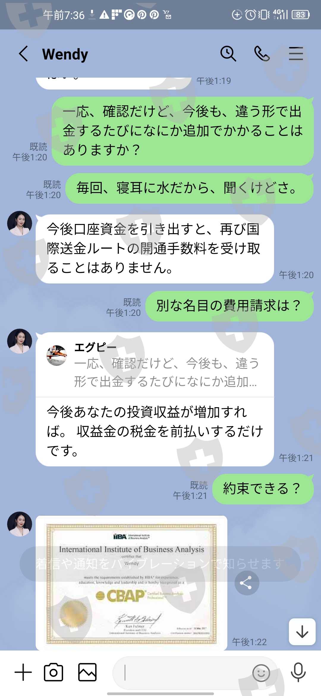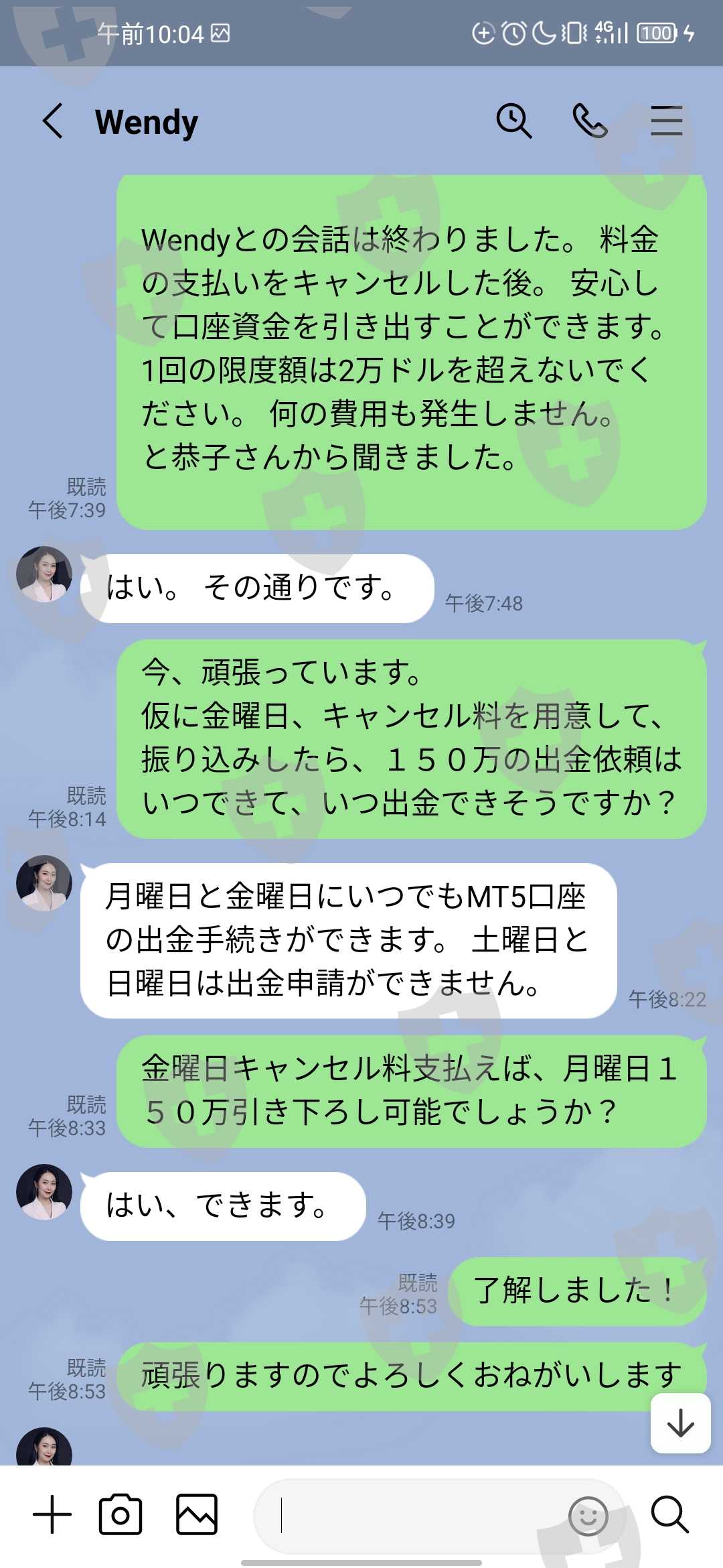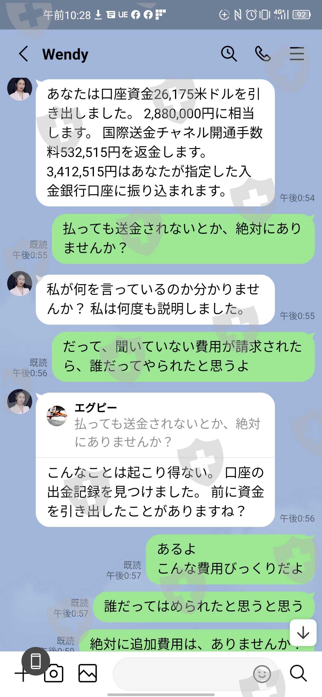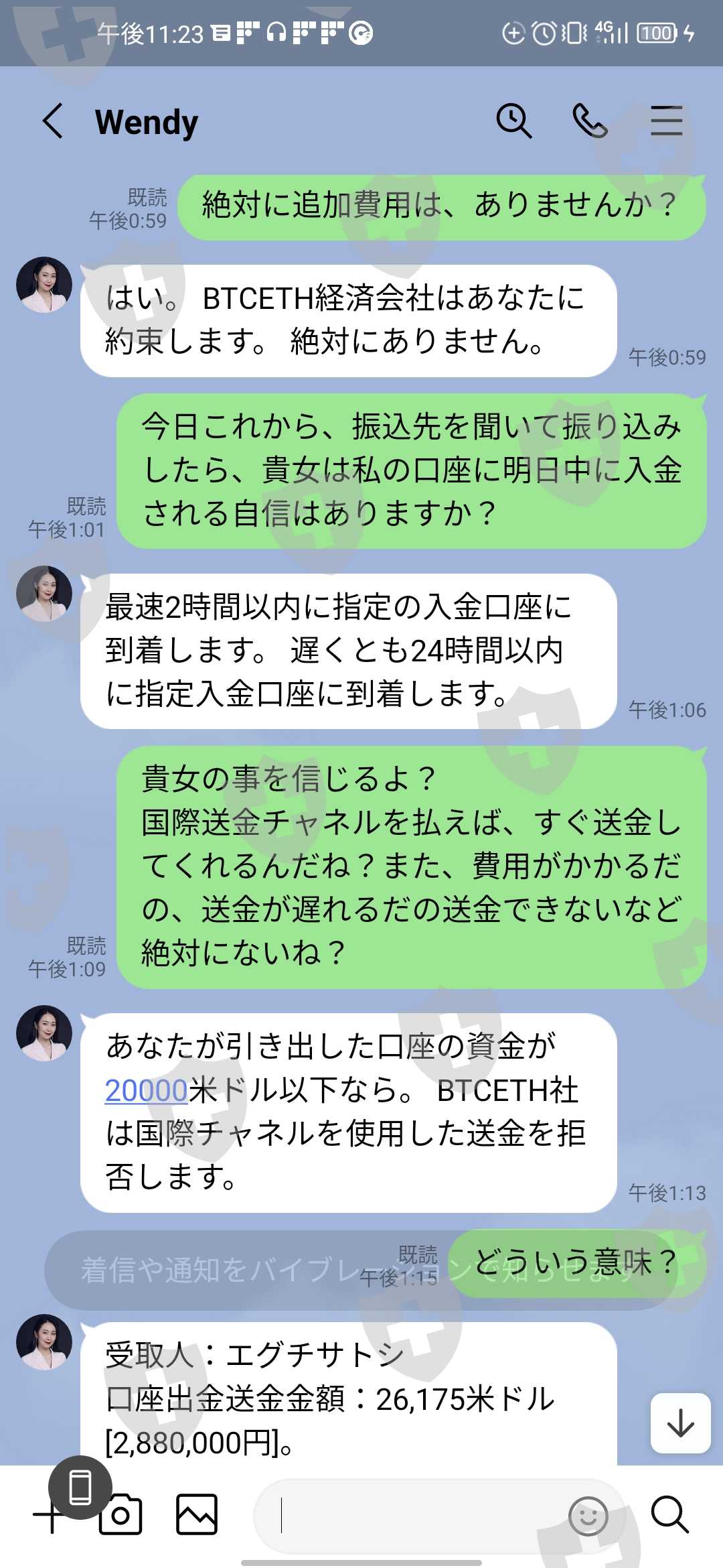 いざ引き出しをしようとしたら、今度は高額な引き出し申請だから、約50万円の国際通貨チャネルの料金がかかるといわれから、支払いをした。