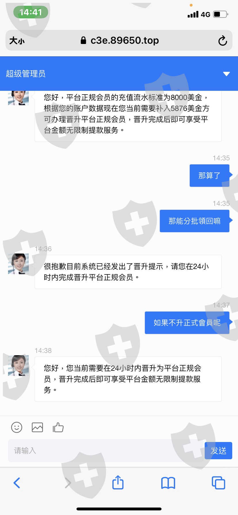 當初只是小小金額充值,結果要出金的時候,不小心寫錯帳號要求充值繳納,繳納後,要求在交易,結果交易後,金額超過普通會員,又要求充值繳納成會員,充值後,又要交易才能出金,要出金時,又出現問題要求充值才能出金…一直到現在還沒辦法出金…帶我交易那個人,說要幫我出金,到現在那個人都還沒幫我出金…