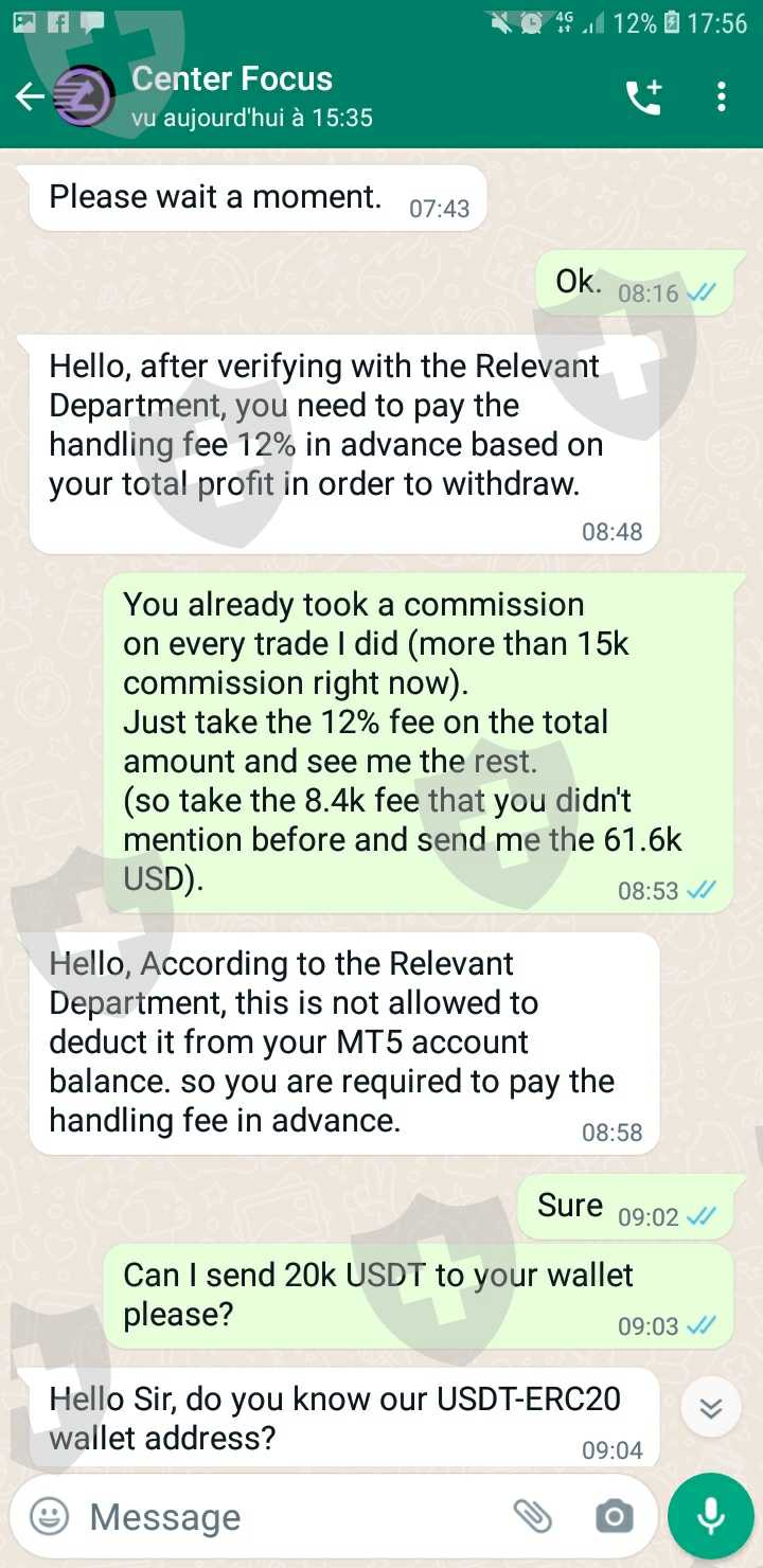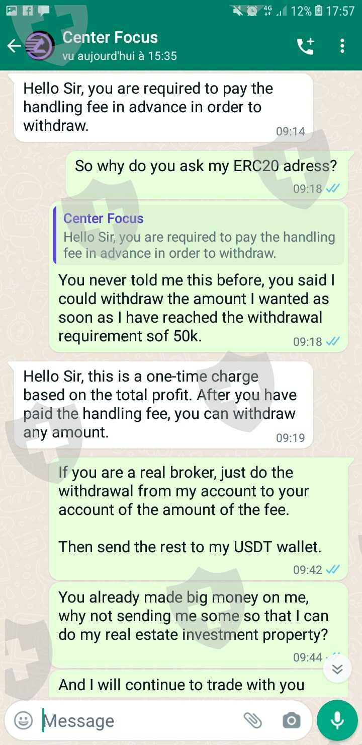 Center Focus first told me that I needed a 50k trade to be able to withdraw any amount. Now that I have reached it (70k), they tell me I need to pay 12% tax first to be able to withdraw. What a shame.