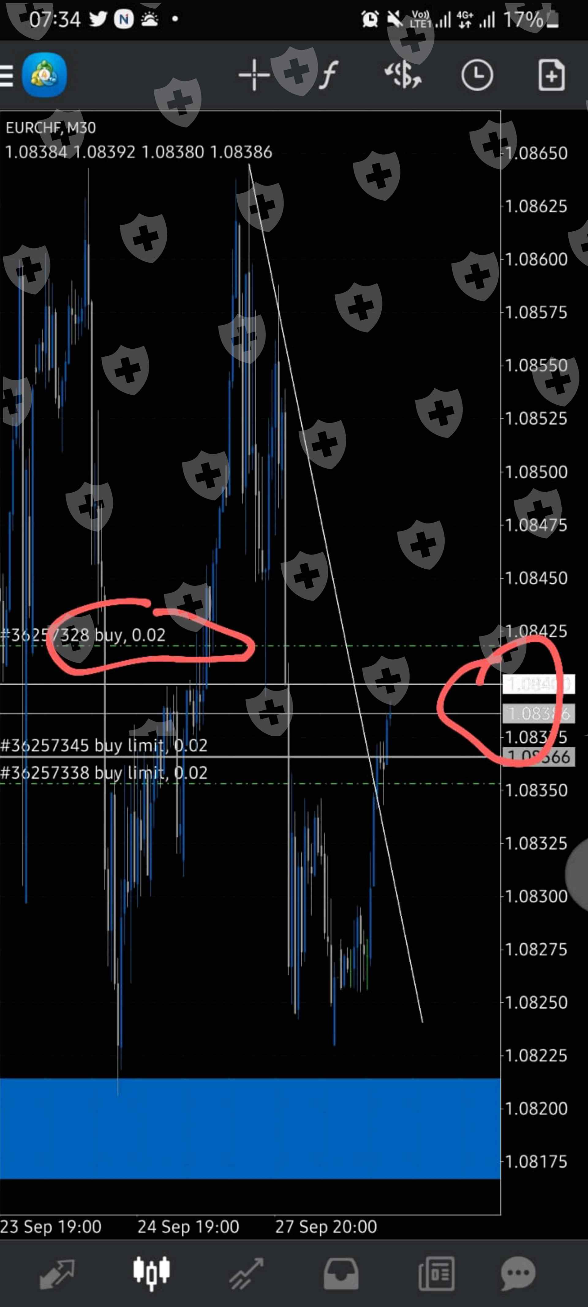 我在EURCHF 做了一笔交易,但它没有以当前市场价格开仓。