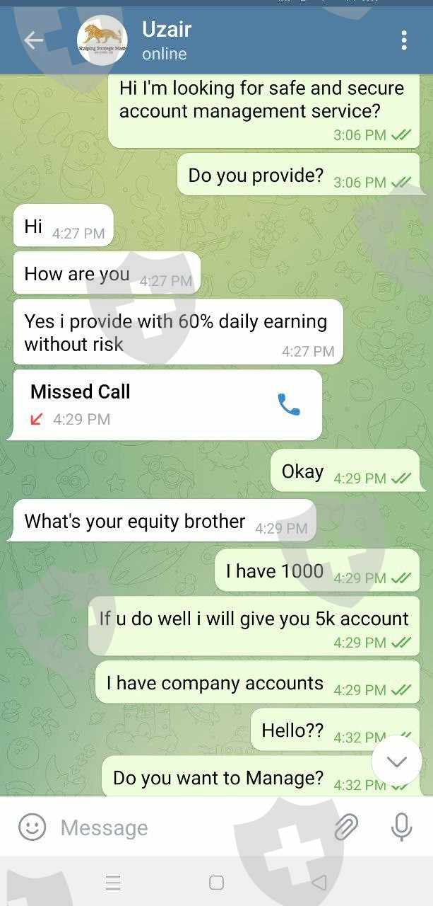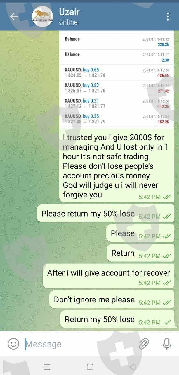 I contacted this guy who provides account management service. I found his service inside broker's telegram channel. So i decided to approach him. He told me he can give me a return of 60% daily. Originally i deposit 1k USD, but then i added more money because he guarantees 60% return daily. Only in 1 hour, 50% of my fund was gone! Ridiculous strategy and bad money management! I think he purposely lose the money so the broker can earn! He wont return or even answer my calls!