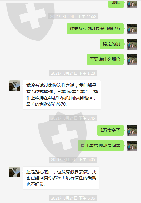 我外汇亏了一些钱后,有一个人加我微信,然后给我策略让我看,我觉得挺准的,他还说他翻仓了,说他们的带单老师很厉害,翻仓轻而易举,我想回本就想试试,就先充了800美元自己跟着期货老师买了原油就爆仓了,后来我看这个老师提供的黄金策略能赚10个点,我就想着再充点钱跟这个老师买,冲了2000美元,刚开始几天赚了800美元,后来一次性就快爆仓了,老师让我充值3000美元挽回损失,不然就没希望了,我就又充值了3000美元,结果之前的都回来了,账户一共连本带利有5800美元,后来这个老师又让我买cn300,在一天之内就爆仓了.此外,这个平台滑点特别严重,明明盯准的这个点位实际买的却是另外一个点位