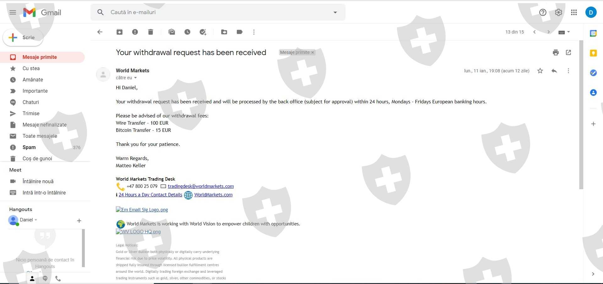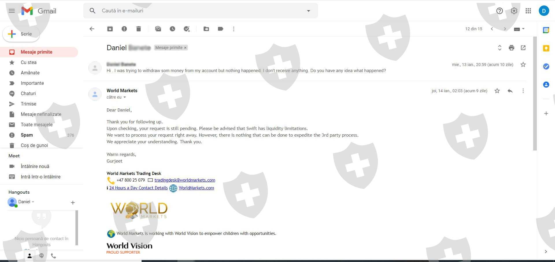 我于10 月在worldmarkets.com 开设了一个账户。起初一切都很好。它可以给我盈利,一切似乎都很完美。没问题,直到我试图取钱。自2021 年7 月1 日起,我试图从可用资金中收回一部分,但到目前为止没有成功过。我什至没有设法提款1 美元。不回复电子邮件。一切骤然凝固。也许有人知道一种方法,我可以通过这种方法至少收回我投资的金额,或其中的一部分。