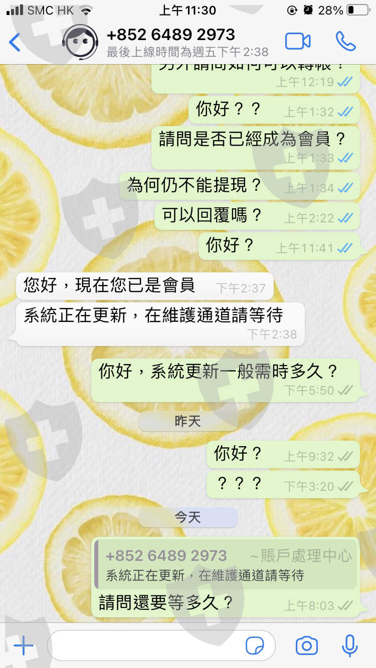只曾經成功出金兩次,其後戶口遭到凍結,解凍後亦無法提議,要求提升至會員成為會員後,卻以維護提現通道為理由,無法出金,查詢維護時間卻不讀不回