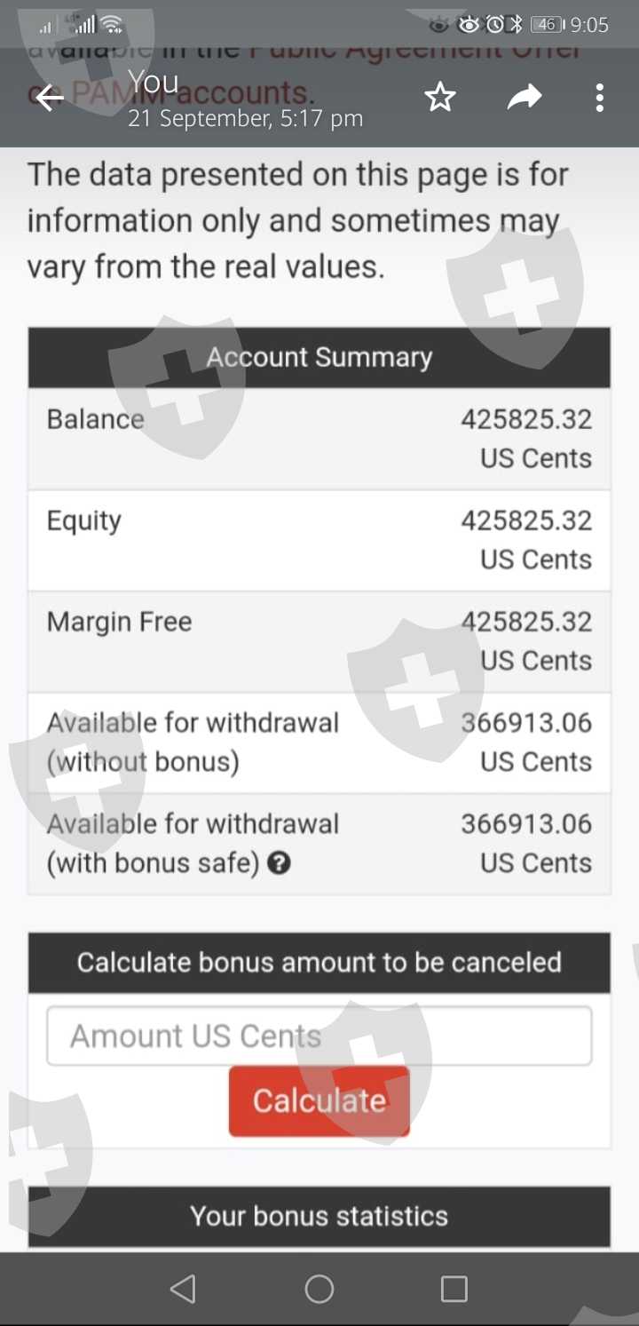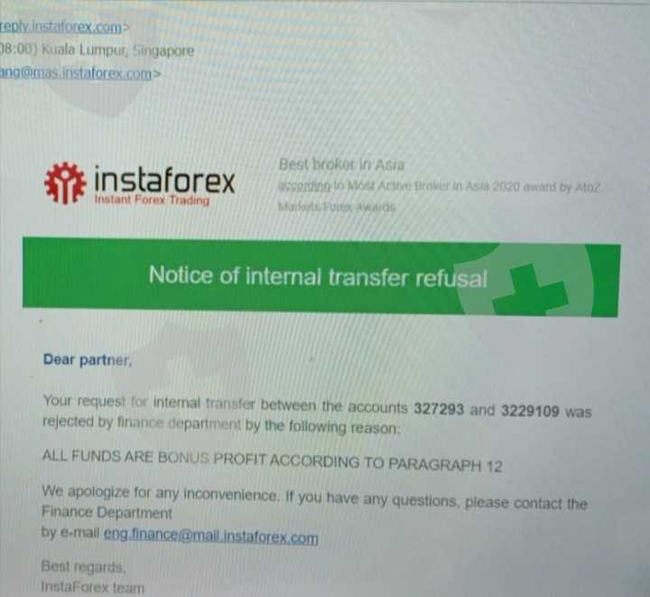 My deposit is $600. Bonus 100% is $600. My profit is $4250. Available for withdraw without bonus is $3600 after deduct bonus. Now when i want to make withdraw.. Is rejected by instaforex finance department.