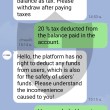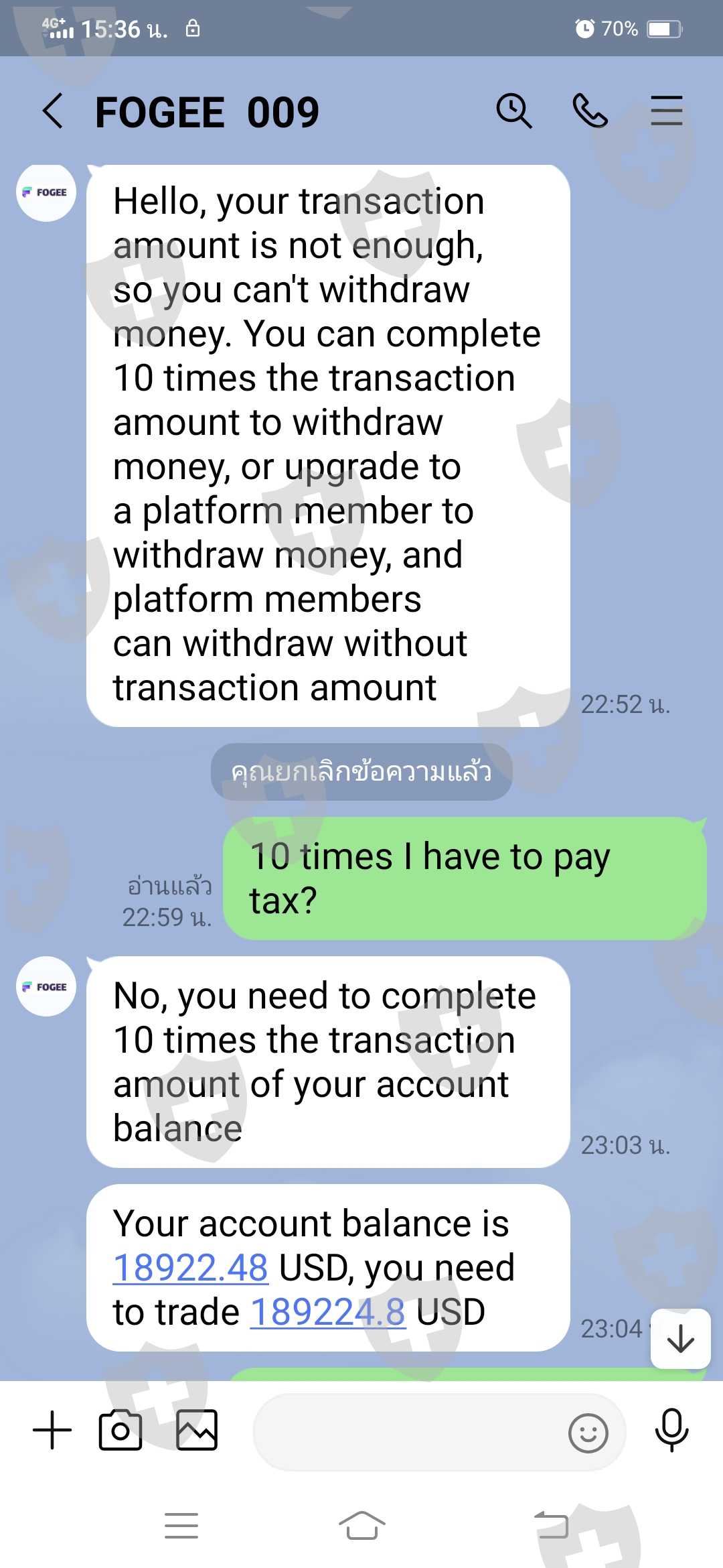 ต้องเสียภาษี20% และต้องเสียค่าสมาชิกอีก 2,300usd เสียภาษีและค่าสมาชิกแล้ว บอกว่าบัญชีของคุณมีความเสี่ยงให้เติมเงินอีก25%เพื่อลบความเสี่ยง ถึงจะถอนเงินได้ ยังถอนเงินไม่ได้