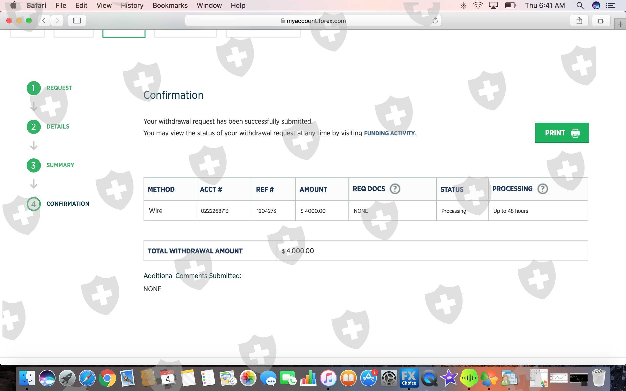 I submitted a withdraw on 1/4/2018 for 4000$ and every since then this company has been giving me the run around.I never had any problem withdrawing smaller amounts under 1k.Its been two full weeks since my request and my money is still not in my bank account.I have contacted Forex.com/Gain Capital LLC about 10 times with my concern.Their initial response was that I was currently in trades and they sent me an email saying that. Here is myWithdrawal Request -