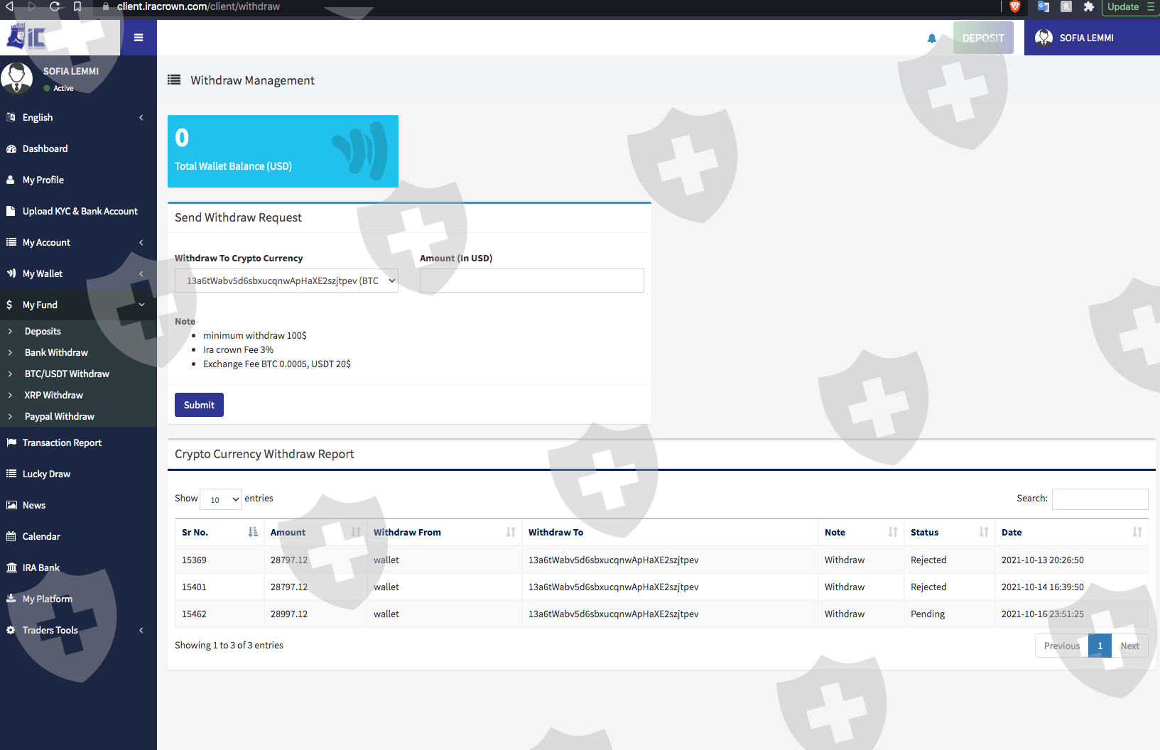First of ALL their support email provide on the website dont exist. I tried to send an email to their support many times and all the time i got the error message saying that email doesnt exist. Second is they dont proceed with the withdrawal of my funds. They also have a page on facebook that i contact and they only reply to my mesages when i told them i had contacted FINTRAC about their firm, which i really did. They say they are regulated by FSA and are Fully licensed and authorized by Fintrac Canada. I have already call FINTRAC and i sent also an email to FSA to file a complaint about this company. If IRA crown dont proceed with my withdrawal ill report them to FSA, FINTRAC, all the social media they have page, forex forums. Following are the proofs.