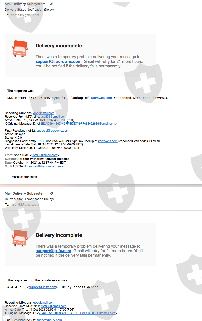 首先,他们在网站上提供的支持电子邮件是假的。我多次尝试向他们的支持人员发送电子邮件,但一直收到错误消息,指出该电子邮件不存在。其次是他们拒绝出金, facebook 上也有一个联系页面,当我告诉他们我已经就他们的公司联系 FINTRAC 时,他们说自己受 FSA 监管,并有 Fintrac Canada 的完全许可和授权。我已经给 FINTRAC 打电话,还向 FSA 发送了一封电子邮件,对这家公司提出投诉。如果IRA Crown不同意出金,我就在 FSA、FINTRAC、社交媒体页面、外汇论坛上曝光他们。以下是证据。
