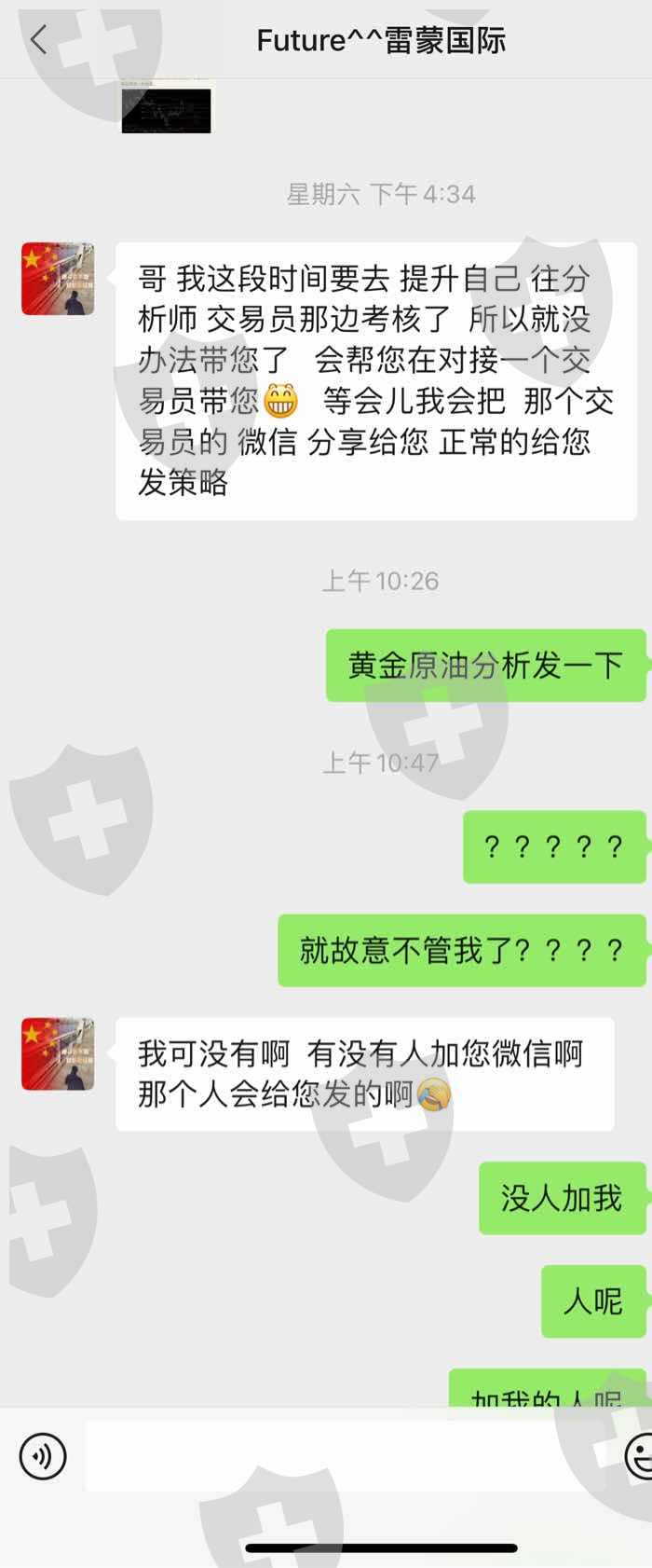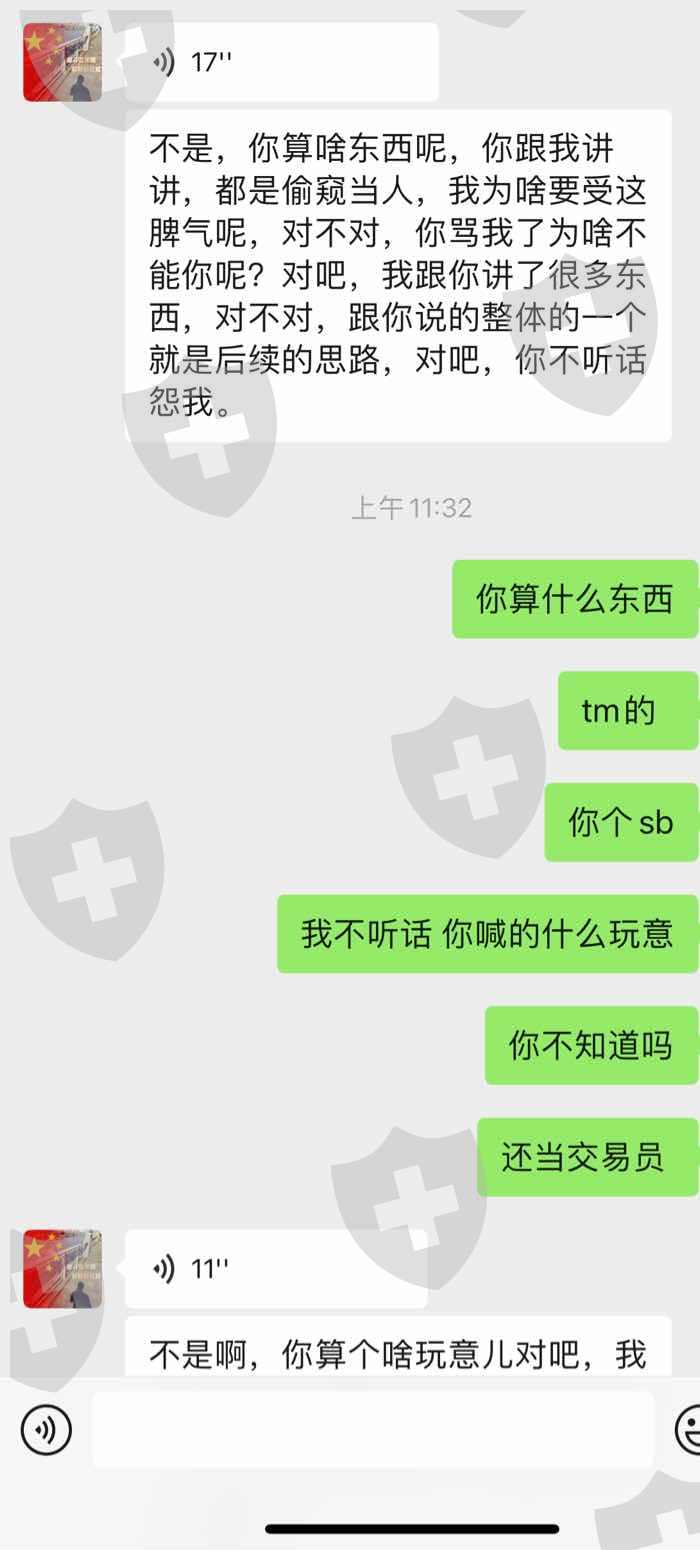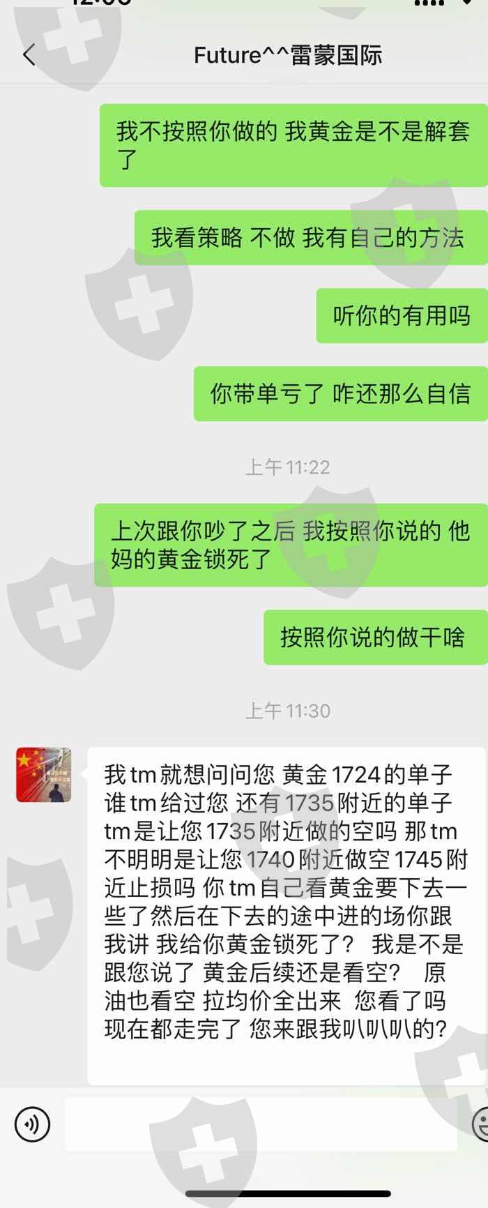 联系我的微信昵称Future,刚开始利用策略引诱做单 后来我入金了,结果发现黄金原油除了40个点差外 还有30美金手续费,后来带单不设置止损,一直扛单,最不能让我忍受的是这个业务员开口骂人,现在做业务都这么嚣张!