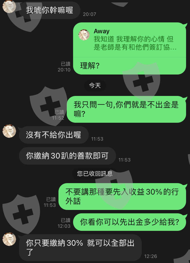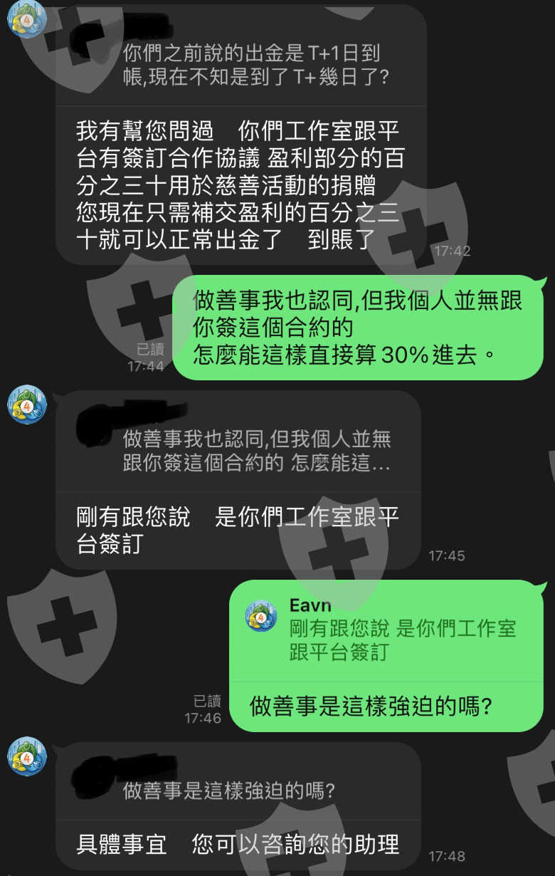 一開始出金2次(110 USD),後來獲利後要再出金,整個過程中就是許多理由、推託…等種種原因不出金。最後說,因為工作室裡的老師跟他們(券商)簽訂了有獲利就要繳其中的30%來做善事,才能出金而且這30%不是從獲利中扣除,而是要另外再繳交30%才能出金。