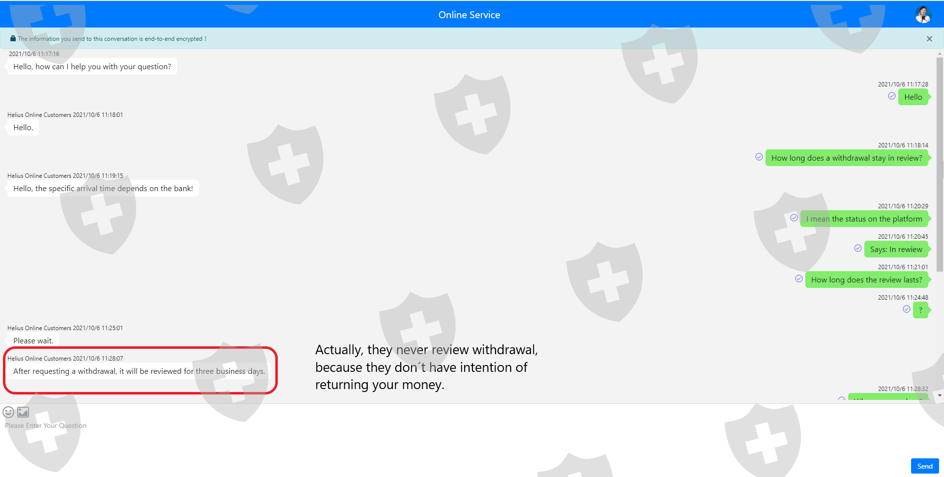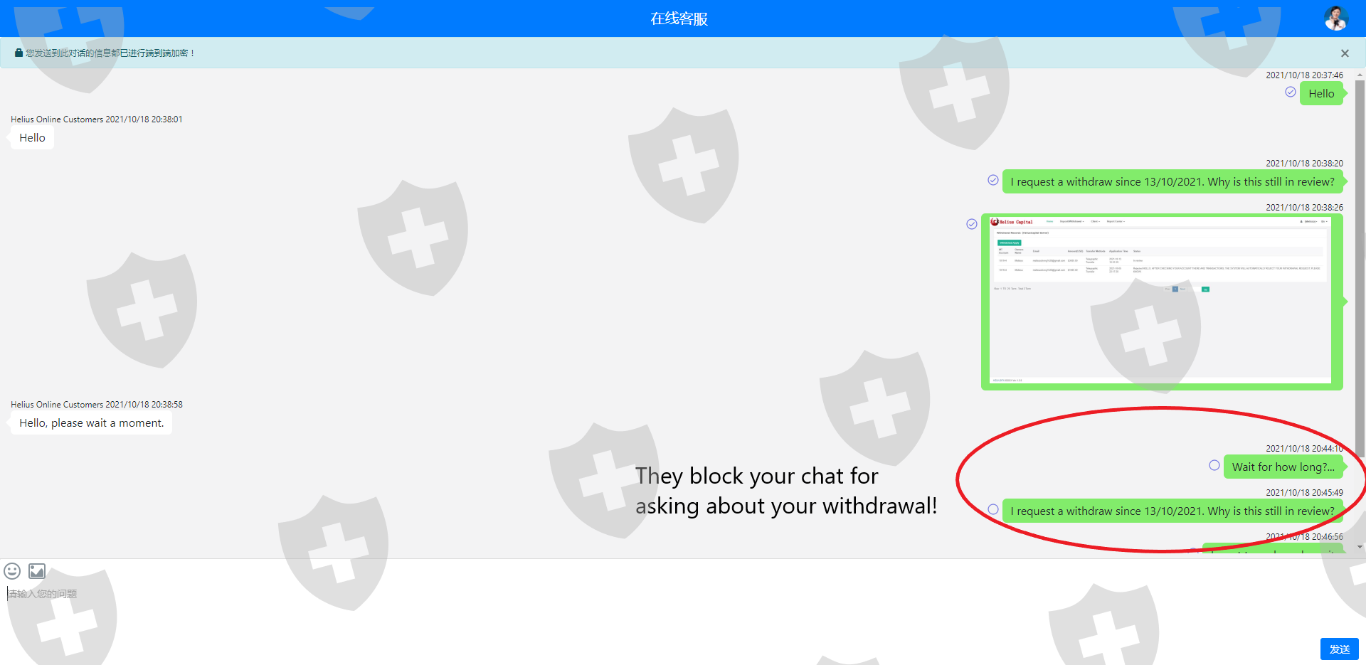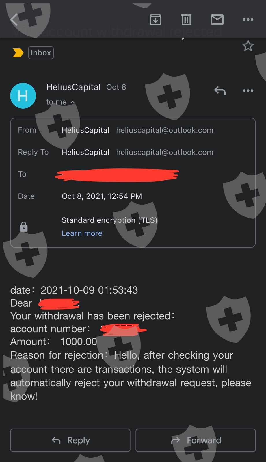 永远无法出金,Helius Capital是一个骗局,黑平台。提款申请发送后在审核中停留很多天,因为他们没有审核。当您向客服询问提款状态时,他们会以不合理的理由拒绝提款,例如:在MT5帐户中进行交易,或者他们只是不回复。这是他们的真实网站: https://www.helius.pro/cn/,Whatsaap 账号:+852 9681 4616 (香港)