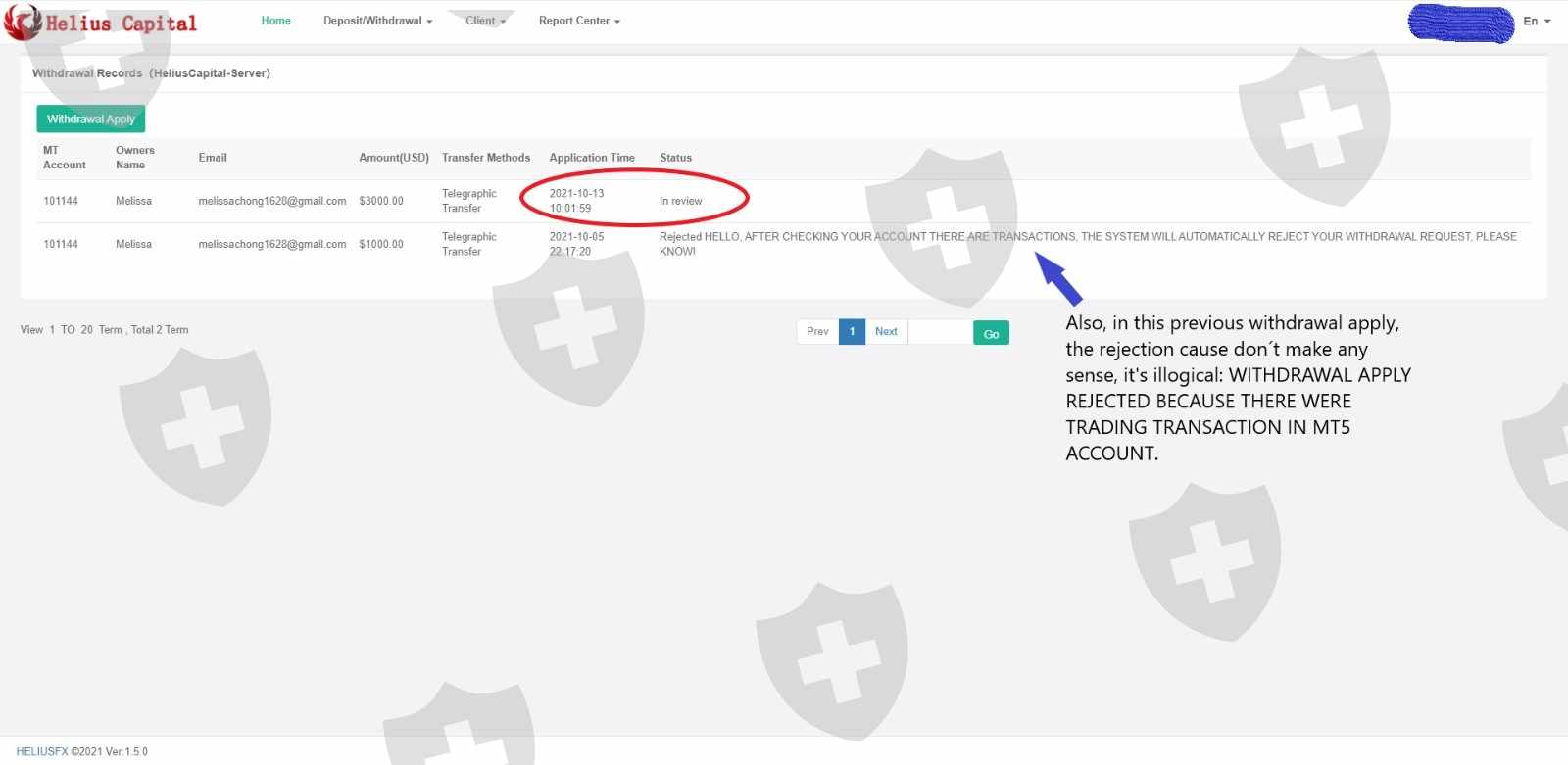 You will never be able to withdraw your money in Helius Capital because it´s a scam, pretending to be a broker. After withdrawal apply is sent, it stays in review for many days, because they actually don´t review it. When you ask about your withdrawal status in the custum service online chat, they reject the withdrawal for reasons with no sense, such as: You are making transaction in you MT5 account!, or they just block your chat.This is their actual website: https://www.helius.pro/cn/Whatsaap number +852 9681 4616 (Hong Kong number)Attachments: Some profiles they use to scam.