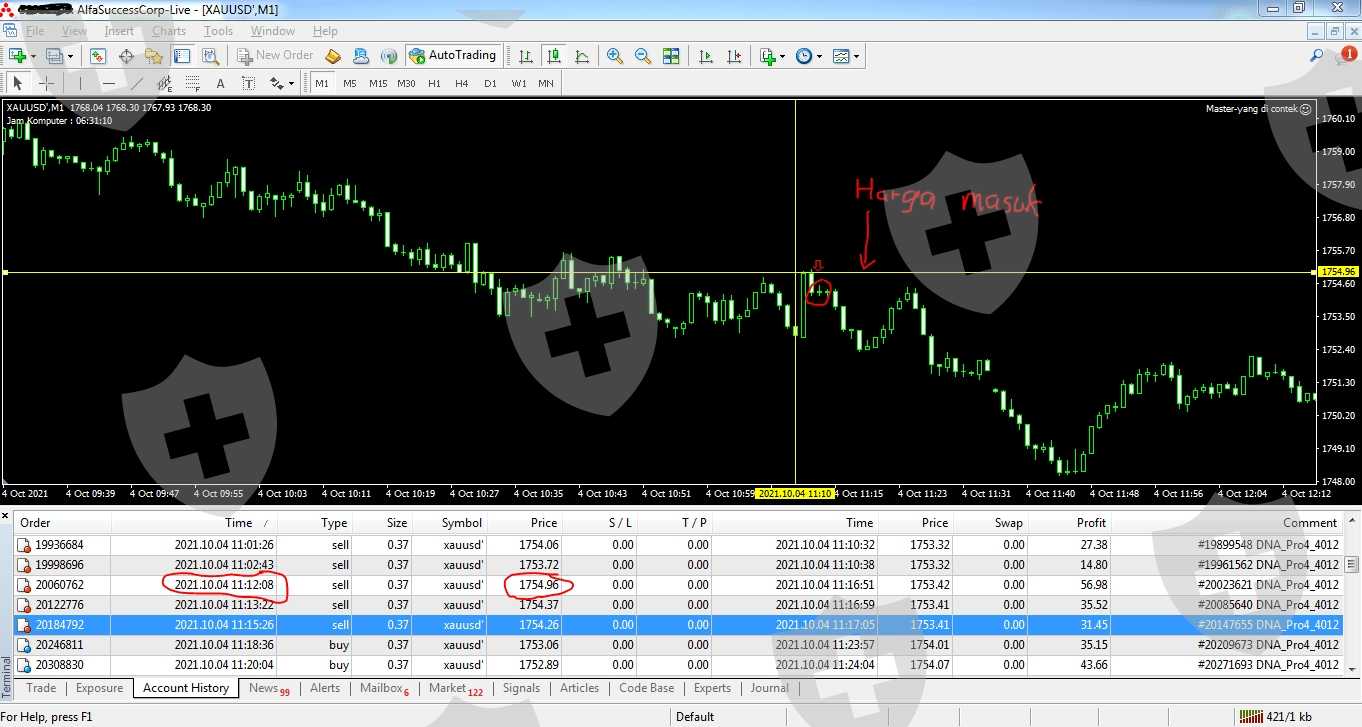 This transaction in the account history was recorded at 11:12 (1 minute earlier), and the entry price was at 1754.96. Meanwhile, if we look at the candle at 11:13 minutes (red circle), the highest High is 1754.52. But miraculously this DNA Pro robot can enter at a price of 1754.96 (yellow horizontal line). So when this transaction is entered, the position has immediately made a profit of 4 pips. its definitely scam. potentially ponzi scheme