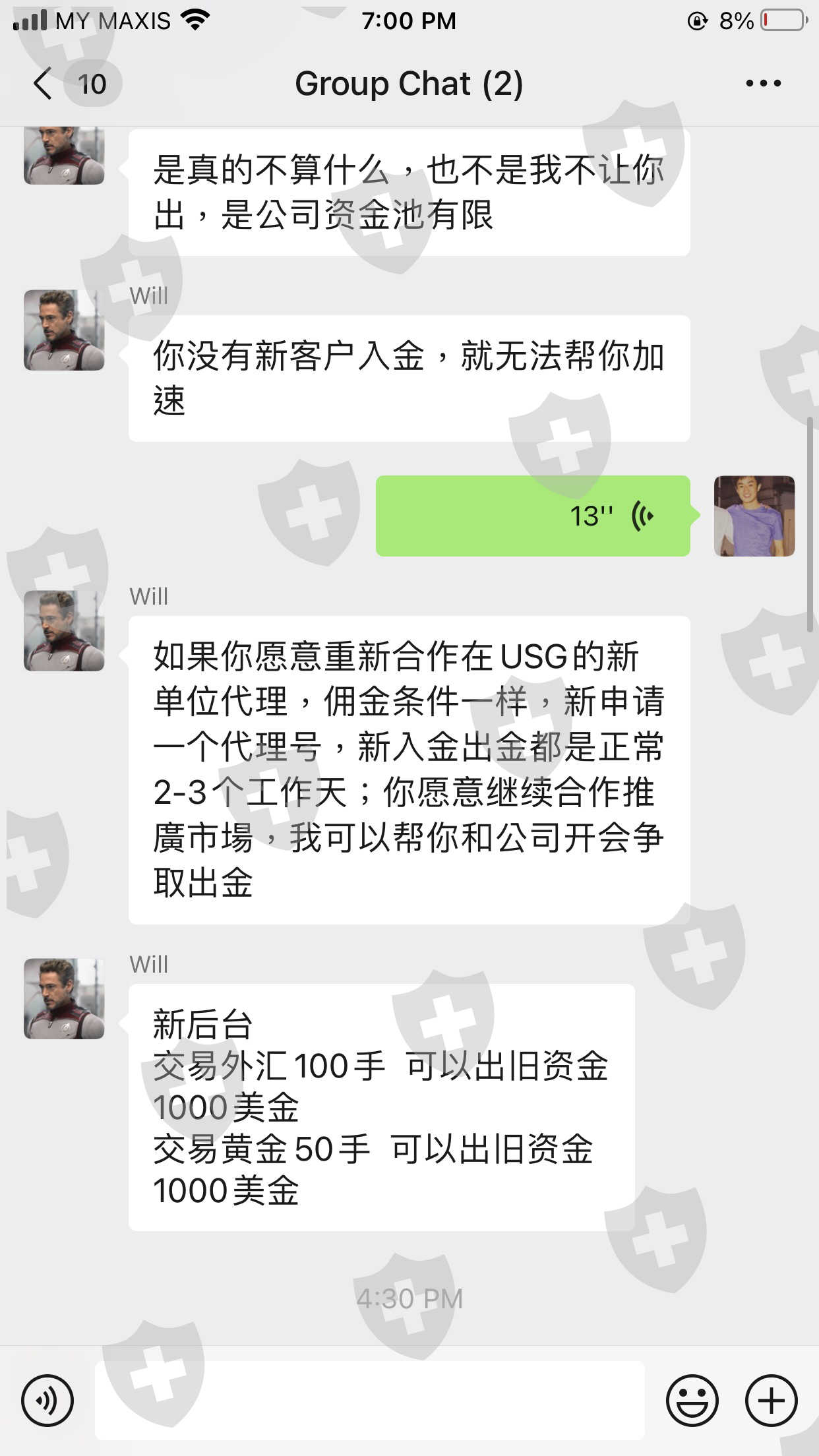 I withdrawn 405USD from my account, it passed two months and I still haven’t received my money. At first, I politely asked the customer service and the person in charge for about 10 times to fasten the withdrawal time, they replied me with their typical customer service script with no action taken. The person in charge said if I wish to fasten my withdrawn process, I must introduce new customer into USGFX, this is a Ponzi scam, the whole USGFX is a scam. they cheated my 405USD