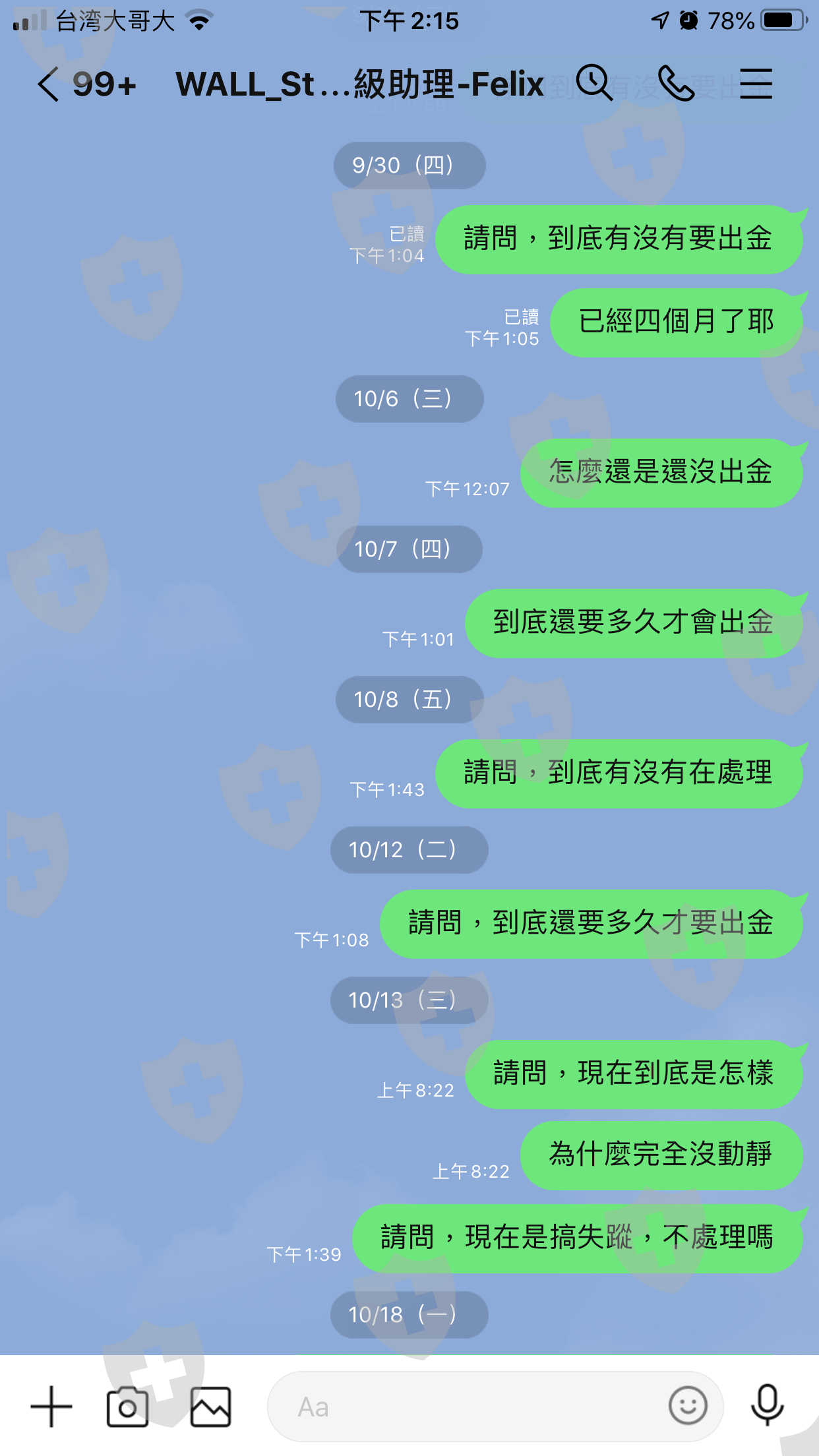 9/9華爾街投資顧問公司Line客服開始不讀不回,發e-mail至其客服,也只回有初步結果回電郵通知