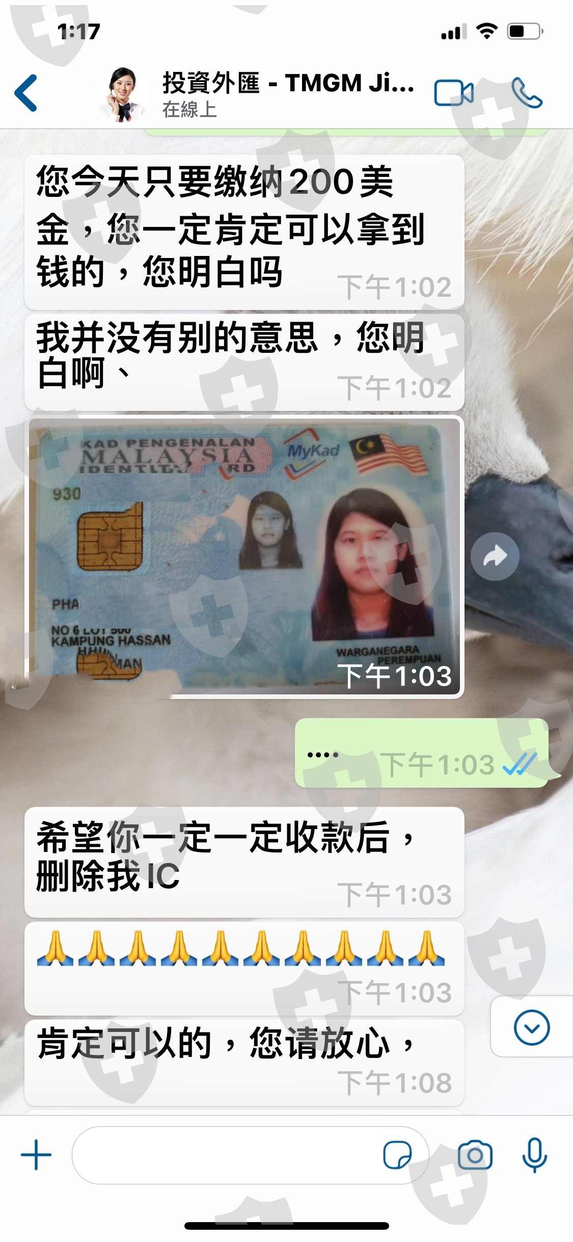 頭到尾我沒盈利過 就在2012年 5月23號 做提現 直到 如今只有一直貼錢做出金 可是現金 或者 USDT 不能到我的火幣銀行戶口 一致的拖拖拖。TMGM 客服也拿她自己本身的大馬身分證來做 保證 擔保 一定能順利進行出金我自己也不懂是真的還是假的 你們自己看看以下 我和客服留言對話