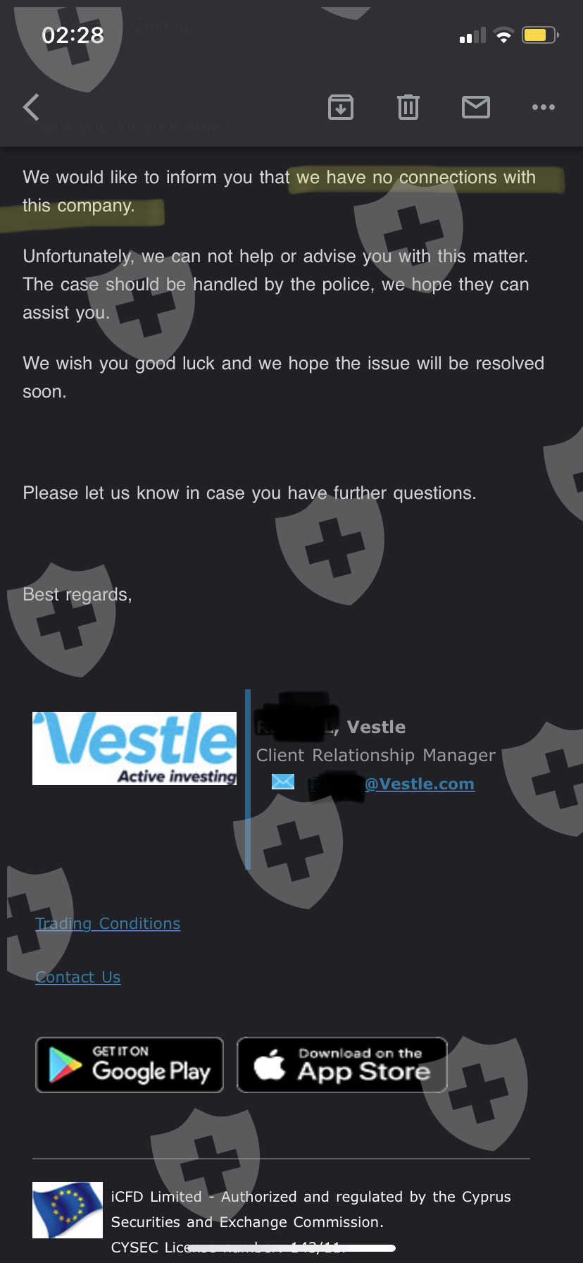 我已經寫信問過真正的Vestle投資公司,他們表示跟這個app沒有半點關係?而且我投資進去的錢全部都被騙走了!客服還封鎖我的Whatsapp.Line還有app上面的線上客服!還什麼沒收到款項三天後可以聯繫客服詢問呢?!封鎖我了我是要詢問誰啊?笑話!