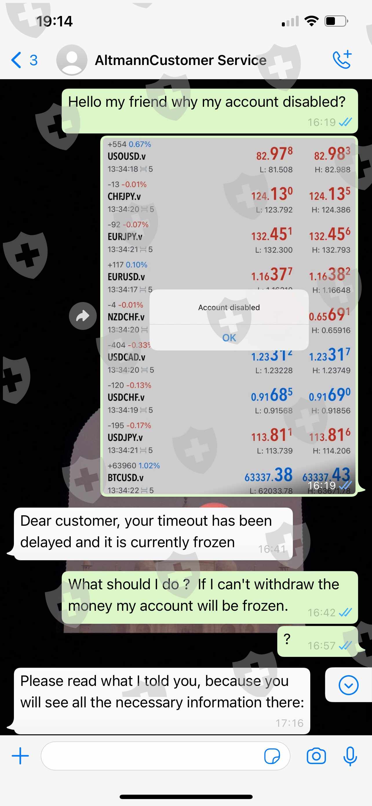 ich hab 8630. $ in mein Konto bei Altman gezahlt und ich hab 26500 $ gewonnen aber trotzdem konnte ich leider nicht abheben weil denen einfach Betrüger sind . die haben mich über WhatsApp blockiert und mein Konto bei deinen disabled 😔😔