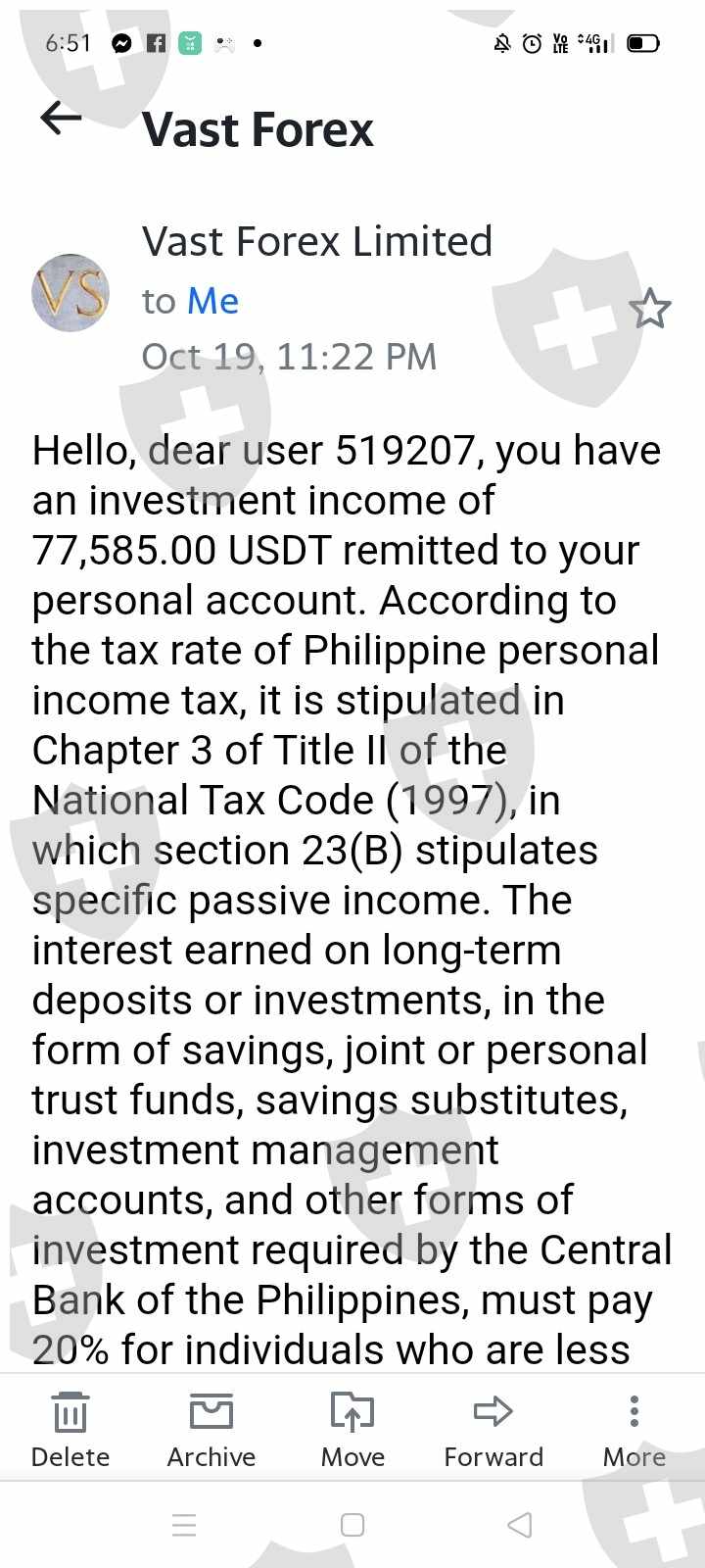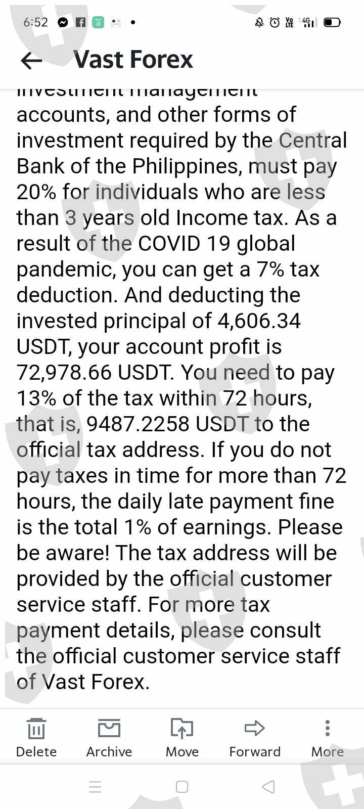 I invested $5330 at Vast Forex. I was so happy when I got my first earning which was $270. I continued to increase my Funds and do the trading using MT5. Until I used the leverage. The leverage helped me to earn almost $77000. When I decided to withdraw my earnings, VAST FOREX tried to hold my earnings. I received an E-mail from VAST that I need to pay my tax amounting to almost $10000.