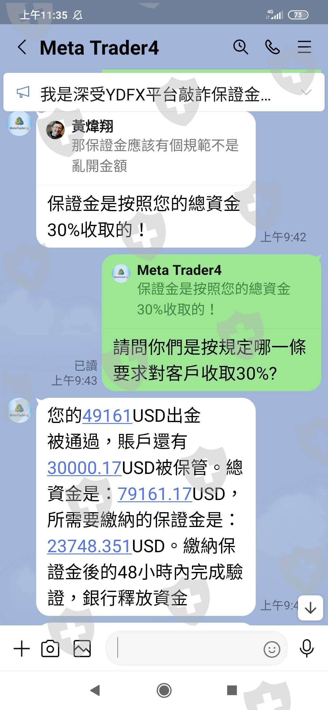 從10/13出金至今,劵商聲稱審核通過,但要先繳交30%保證金才能收到款項,這是YDFX或其它劵商常用這個手段敲詐客戶保證金,我是深受其害的人,請大家要小心!