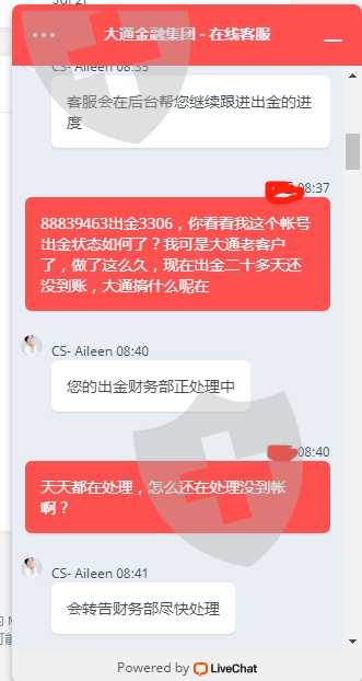 我在大通金融很多年了,也是老客户,有俩账户,88839463出金3306美元在18号扣款后到现在不到账,账户88841182出金10165美元在15号扣款后也一直不到账,本人本来寄予希望大通早点给我解决,可是一直给我压着不给出金,本人无法再忍受直接曝光大通的恶意不给出金恶行