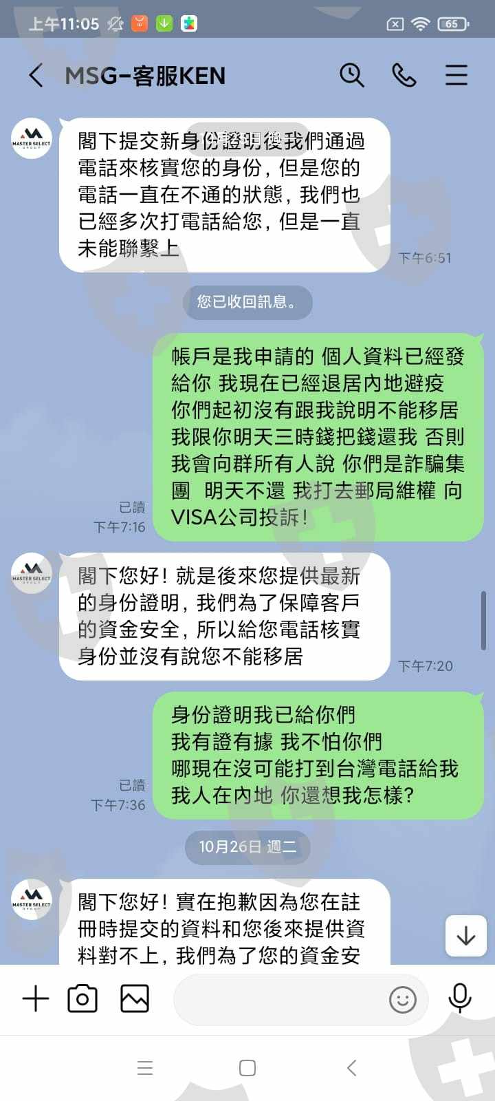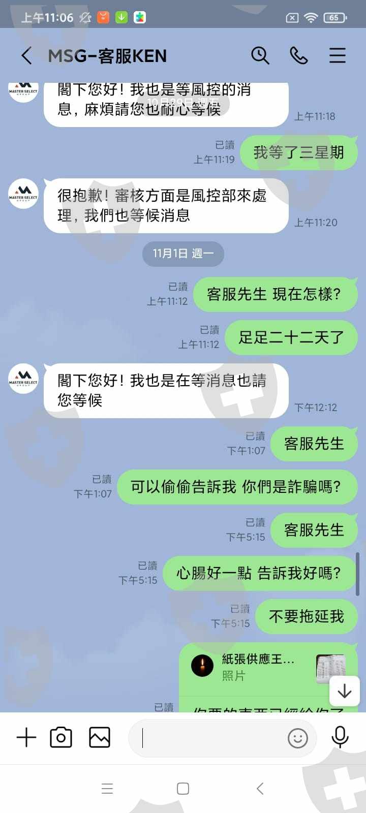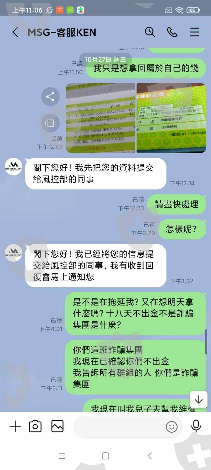 本人在9月29日在msg申請賬戶並在網站顯示驗證成功本人就在9月29日入金5900美元操作兩天後再在 10月1日再入5900美元然後獲利約1000美元在10月11日申請出日到現在還未收到款項第一次說我身份證明有問題 要求我重發身份證第二次說我電話有問題 要求我驗證 第三次要求的金融卡資料 我再提供 第四次要求我的金融卡月結單子到今天11月3日還未出金