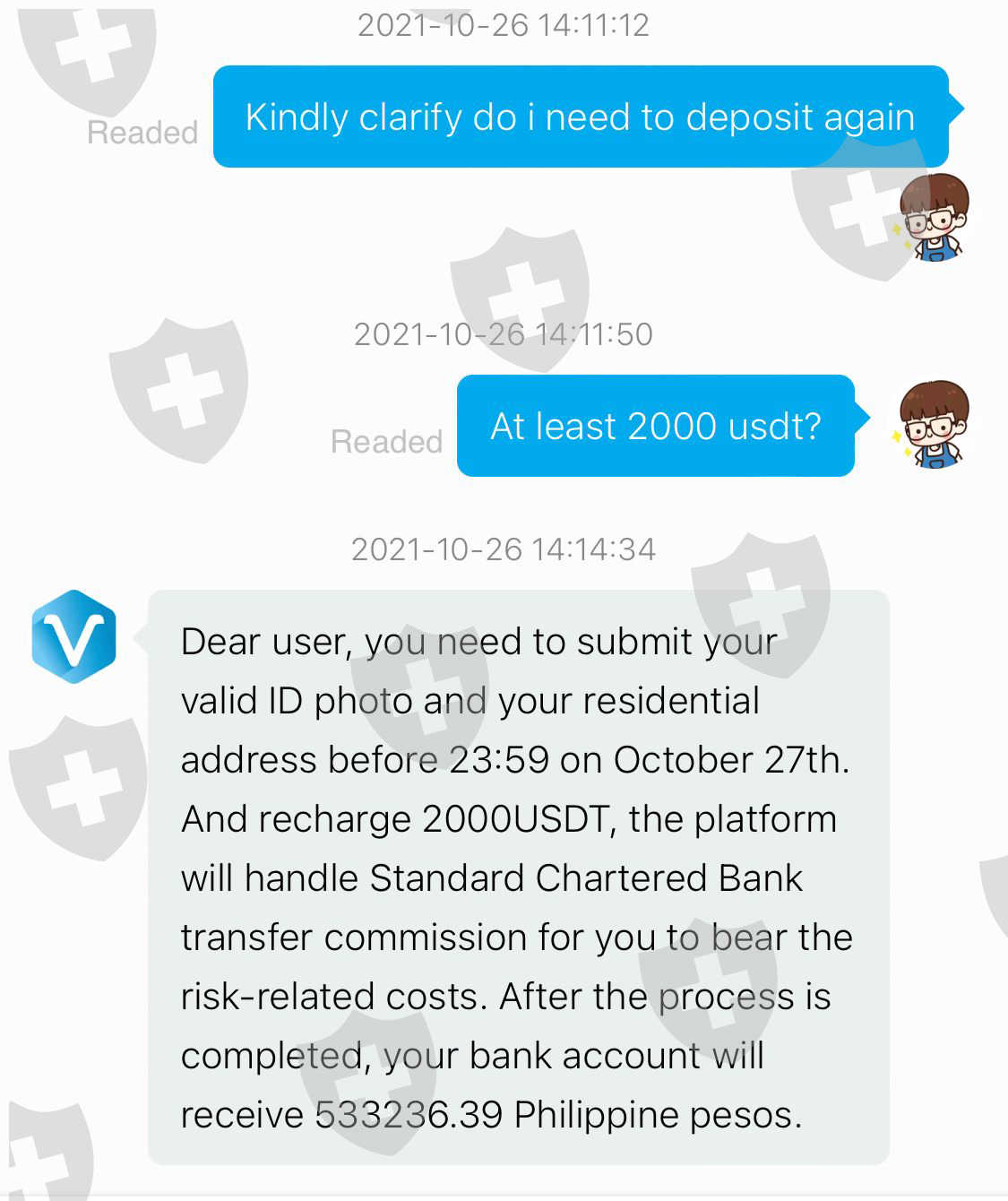 Vast Forex是骗局!!!我无法从 MT5 中提取我的资金。 CS不断要求我存入USDT来充值我的账户。一开始我可以提款。直到我决定增加我的资金。当我准备提我赚的钱时,他们要了很多费用(菲律宾税费、国际转账费、绿色通道费、资料更新费)。希望有人能帮我取回我存入的所有钱。我已经没有积蓄了。
