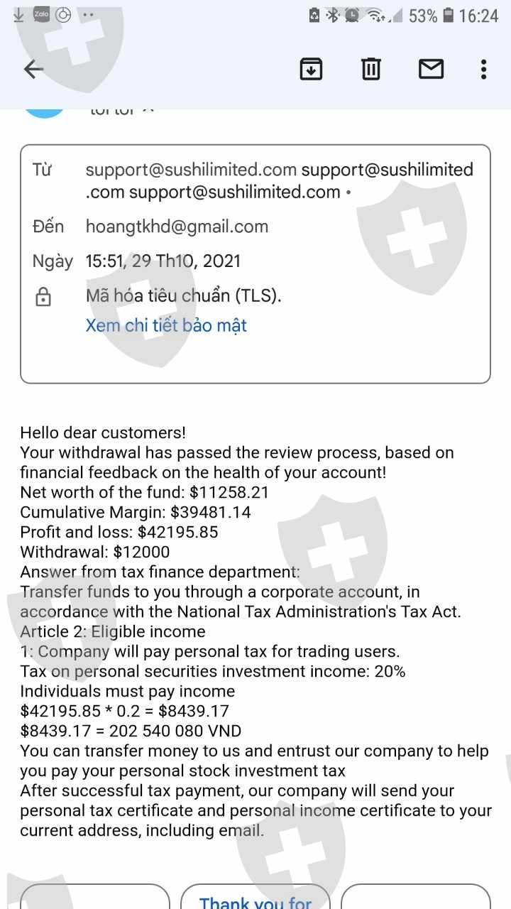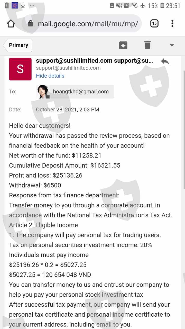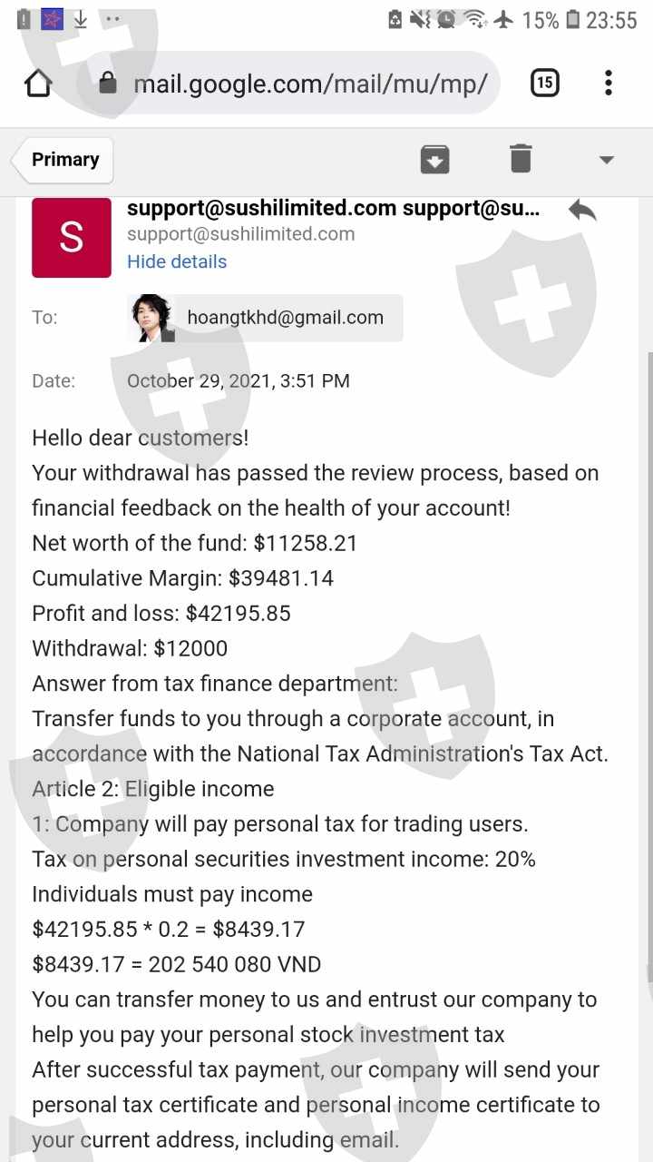 我在 Broker 有一个交易账户SUSHI Global investing Limited.我存入了 11208 美元,盈利金额为 39481 美元。但是当我从 Broker 取钱时SUSHI到我的银行账户,经纪人SUSHI逼我交税。我已经交了税,但我还没有收到钱。我的MT5账户是5303816。