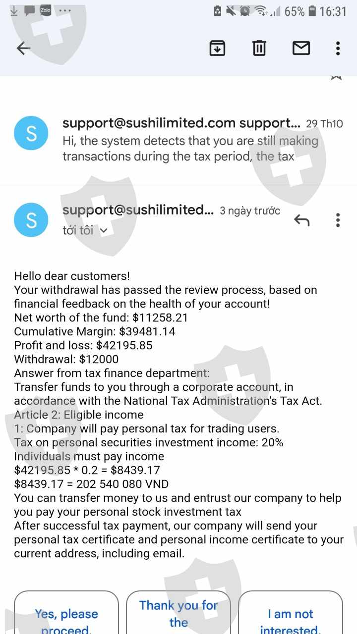 Ich habe ein Handelskonto bei Broker Sushi Global Investing Limited. Ich habe 11208 USD eingezahlt, der Gewinnbetrag beträgt 39481 USD. Aber wenn ich Geld von Broker Sushi auf mein Bankkonto abhebe, zwingt mich Broker Sushi, Steuern zu zahlen. Ich habe meine Steuern bereits bezahlt und das Geld immer noch nicht erhalten. Mein MT5-Konto ist 5303816.