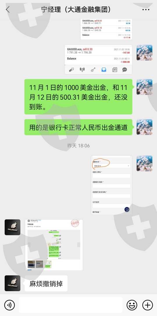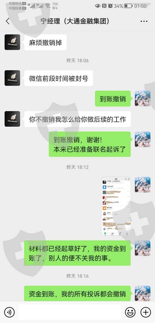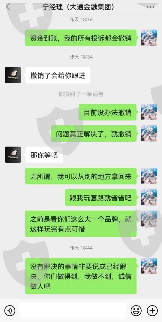 大通金融集团已经不要脸到这种程度了,出金不到账,还用各种理由要求客户撤销投诉,建议大家继续联名从各个渠道起诉、报警,加大力度投诉。