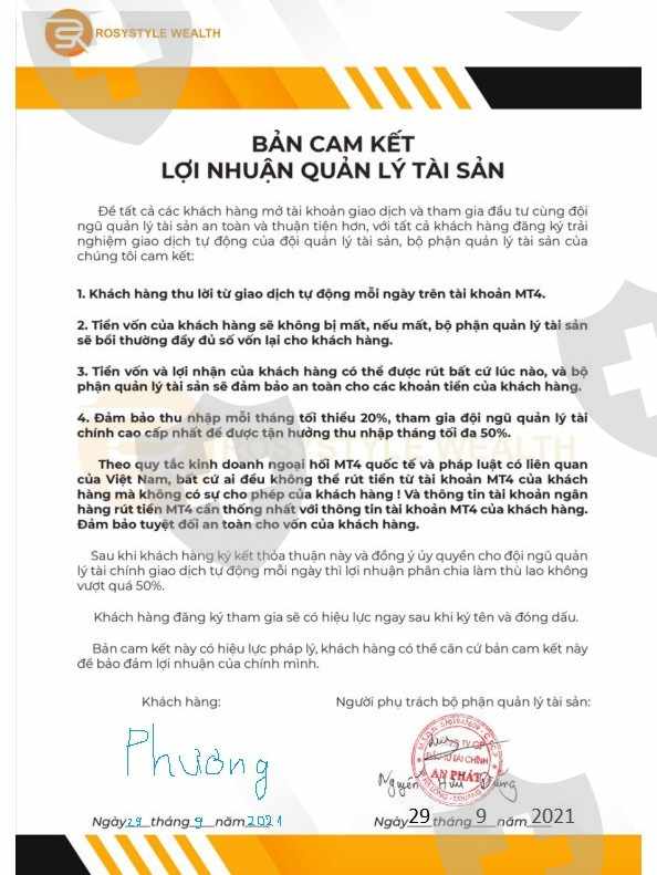 Tôi tham gia đầu tư ủy thác có chia lợi nhuận với Rosytle Wealth Tại Việt Nam, có ký cam kết. Ngày 10/11/2021 tôi có rút 5000 usd và ngày 12/11/2021 tôi rút 9000 usd, tổng 2 đợt là 14000 usd nhưng đến nay tiền vẫn chưa được chuyển vào tài khoản cá nhân Tôi đã liên hệ với bộ phận chăm sóc khách hàng thì được giải thích là Hệ thống quy đổi bị tắc nghẽn, tôi thấy lý do không chính đáng, có DẤU HIỆU LỪA ĐẢO hòng chiếm đoạt tiền của các nhà đâu tư trong đó có tôi. Vì vậy tôi đưa thông tin lên đây để cộng đồng mạng cũng như các nhà đầu tư đang tham gia vào sàn Rosystyle này biết.Tôi đề nghị Rosystyle trả lại tiền cho tôi