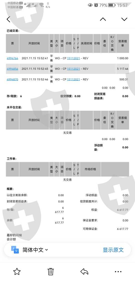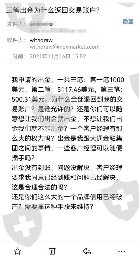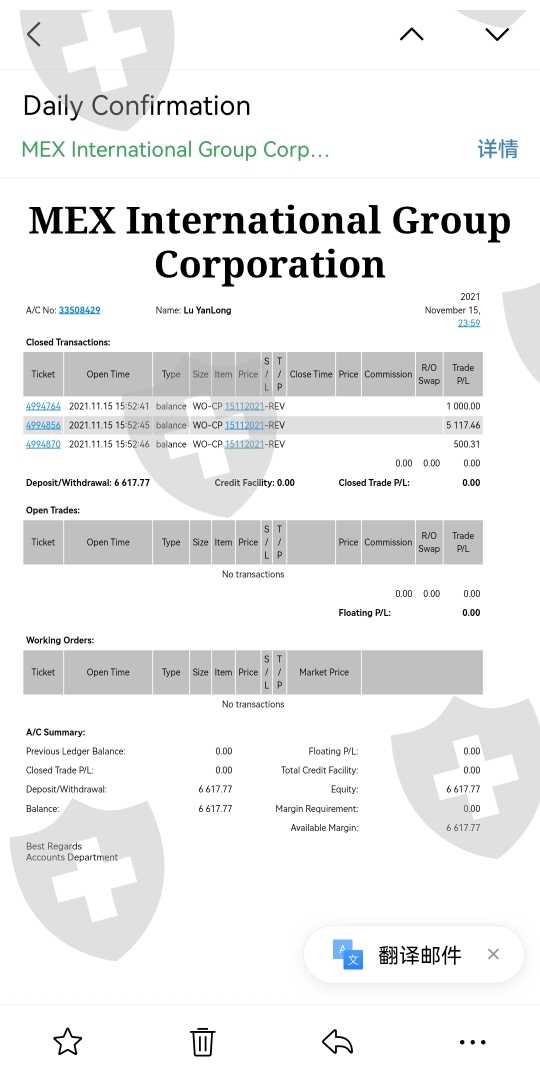 我申请的出金,一共三笔:第一笔1000美元,第二笔:5117.46美元,第三笔:500.31美元,公6117.46美元。出金一直没到账,半个多月后,全部退回到我的MT4交易账户。警方建议所有遭受损失的投资联名报警,上诉,各个媒体曝光,各个渠道投诉。