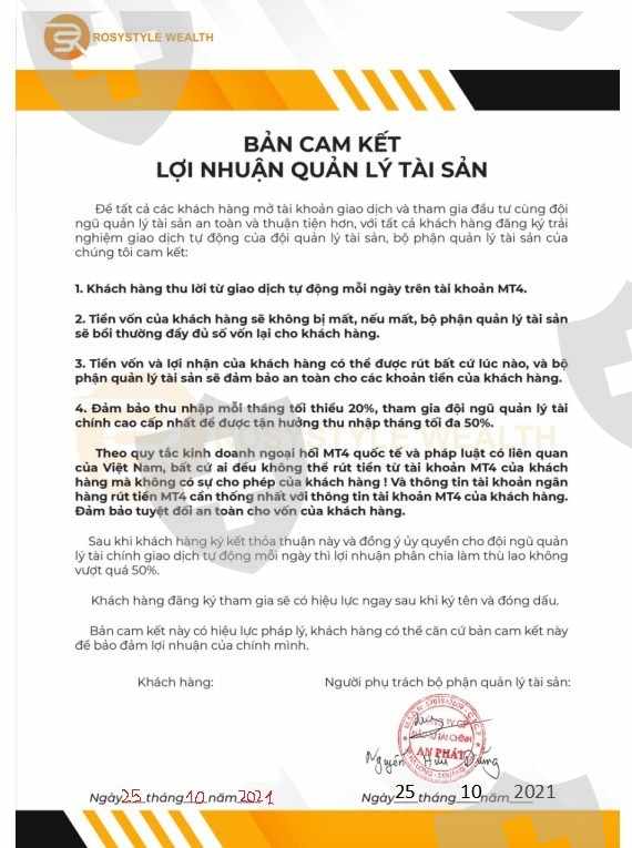 Je participe à un investissement en fiducie avec participation aux bénéfices avec Rosytle Wealth In Vietnam, j'ai signé un engagement. Le 10/11/2021 j'ai retiré 5000 usd et le 11/12/2021 j'ai retiré 9000 usd, un total de 2 fois soit 14000 usd mais jusqu'à présent l'argent n'a pas été viré sur mon compte personnel j'ai contacté le service de soins après . des clients, on m'explique que le système de récompense est bloqué, et pour de nombreuses raisons (voir fichier joint), je ne vois pas de bonne raison, il y a des arnaques pour prendre de l'argent aux investisseurs ça m'a. Par conséquent, je mets les informations ici pour que la communauté en ligne ainsi que les investisseurs participant à cette plateforme Rosystyle sachent. Je demande à Rosystyle de me rendre mon argent. Je posterai jusqu'à ce que ROSYSTYLE WEALTH me paie.