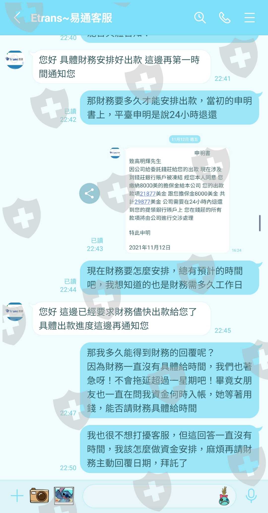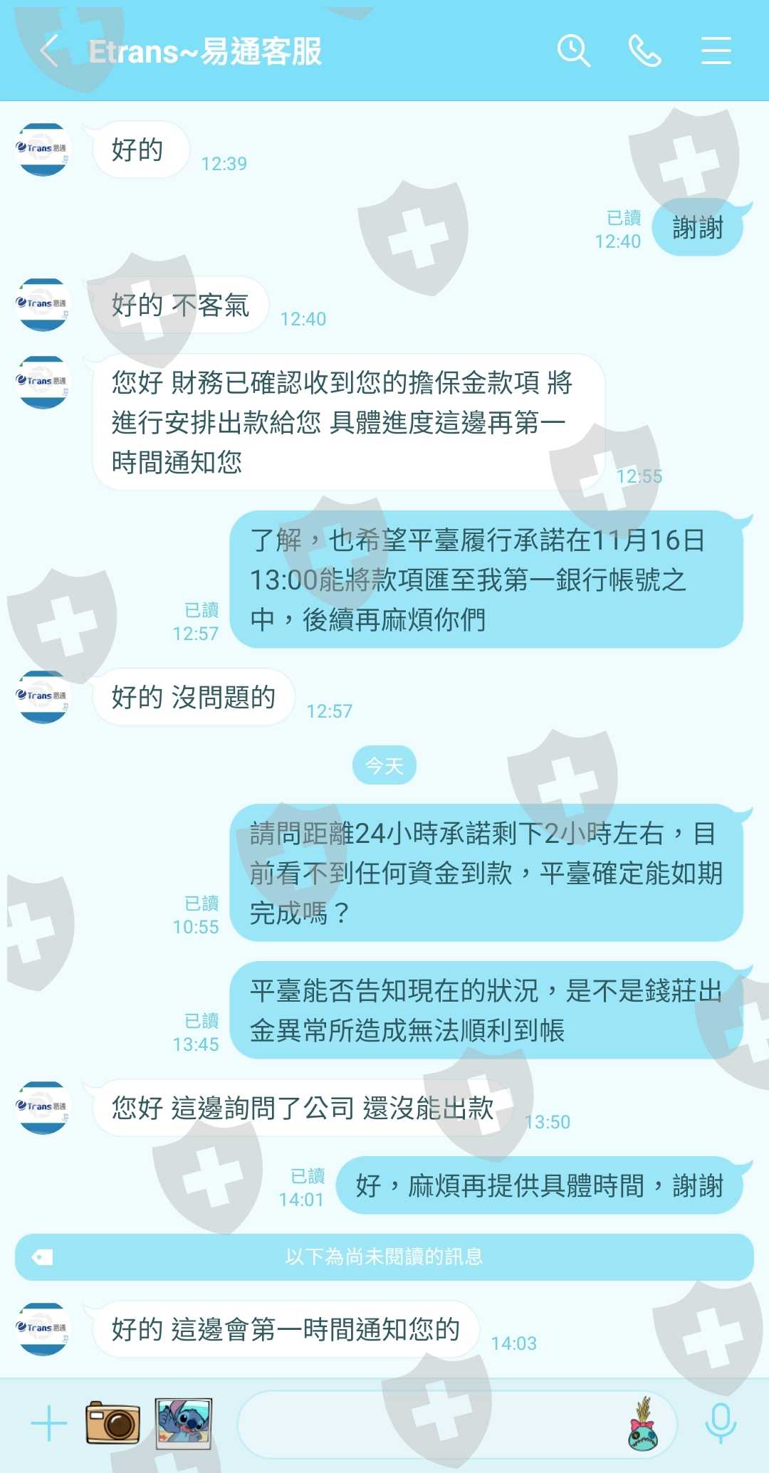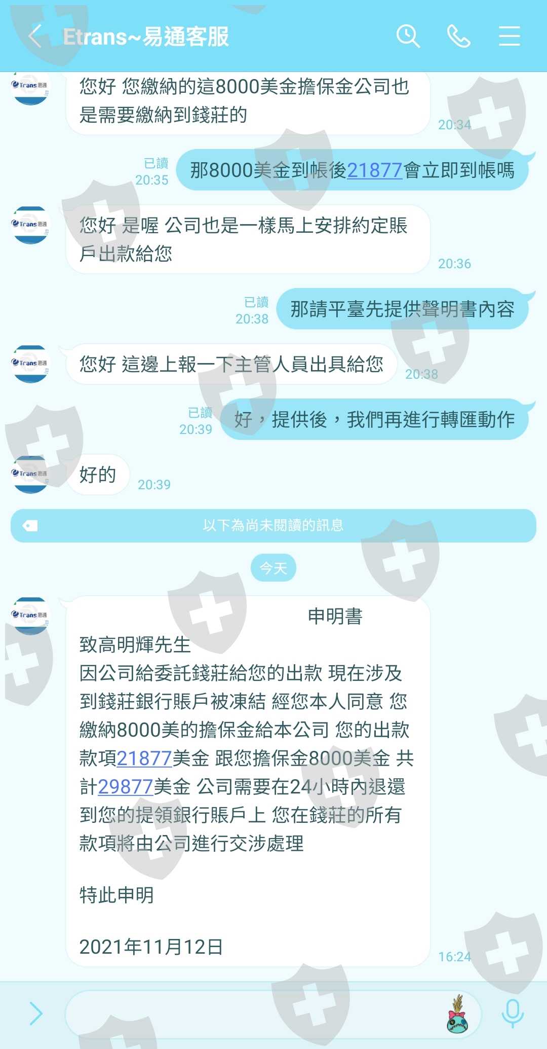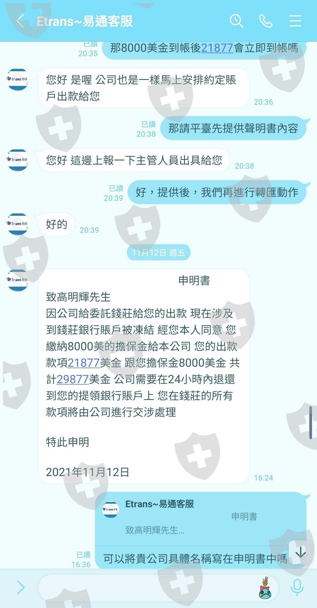 11/11與平臺協商若繳納8000美金的擔保金給平臺,後續錢莊帳戶問題,由平臺及錢莊自行處理,本日在錢莊呆滯的29877美金,平臺於支付後的24小時內,退還至我指定的帳戶,附上平臺申明書,11/15付款後至11/17無法出金甚至不回