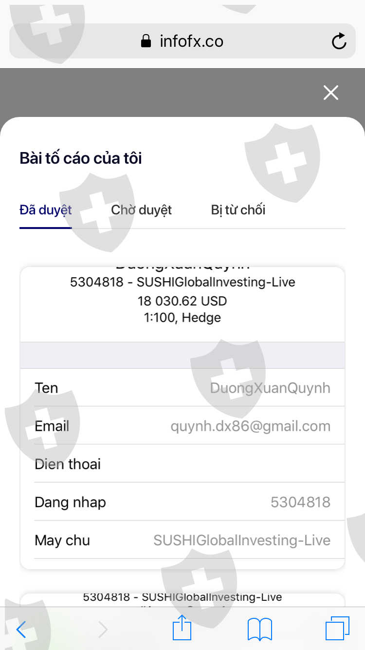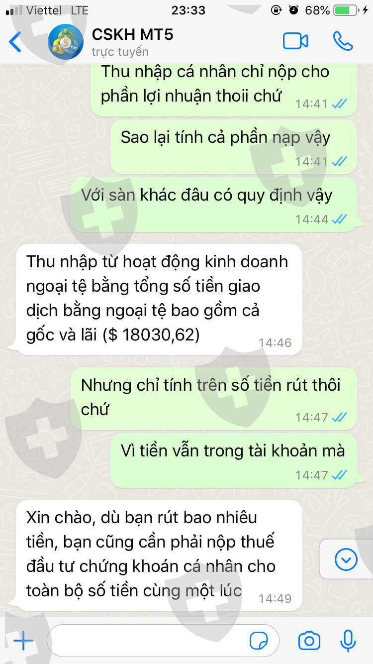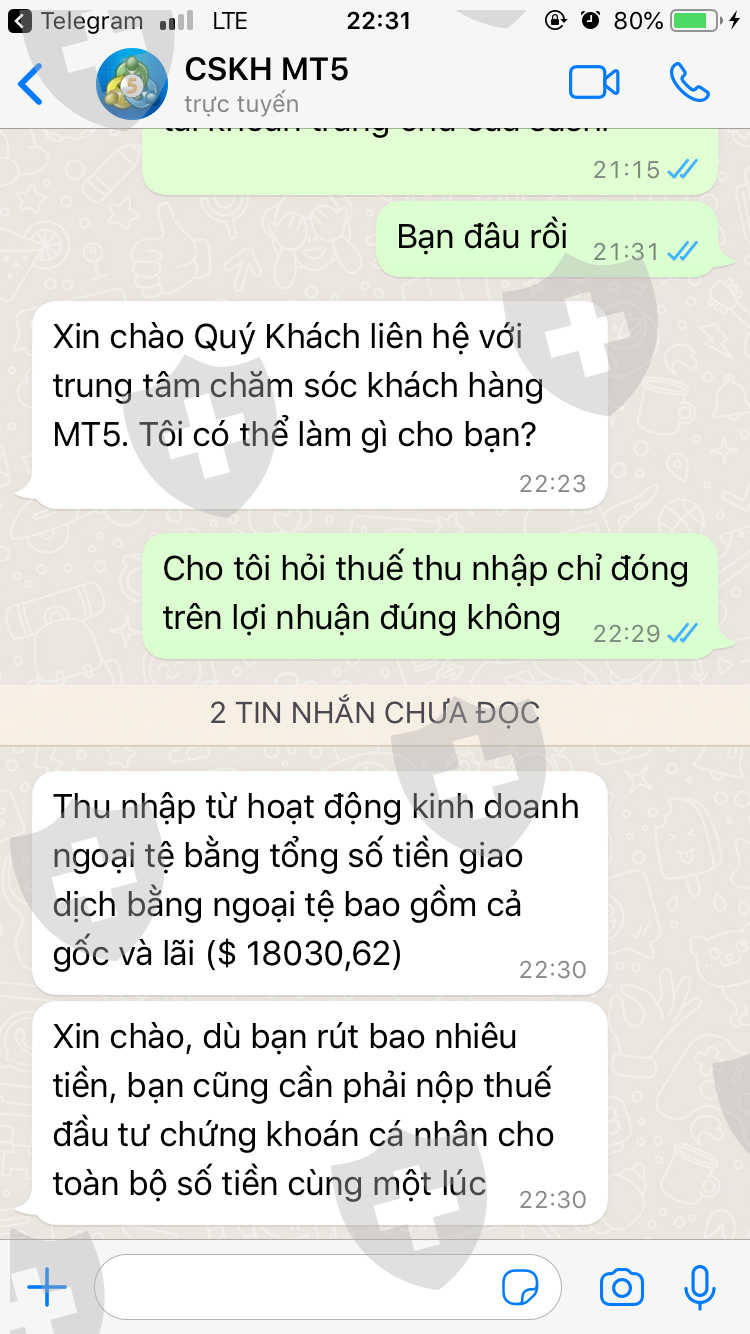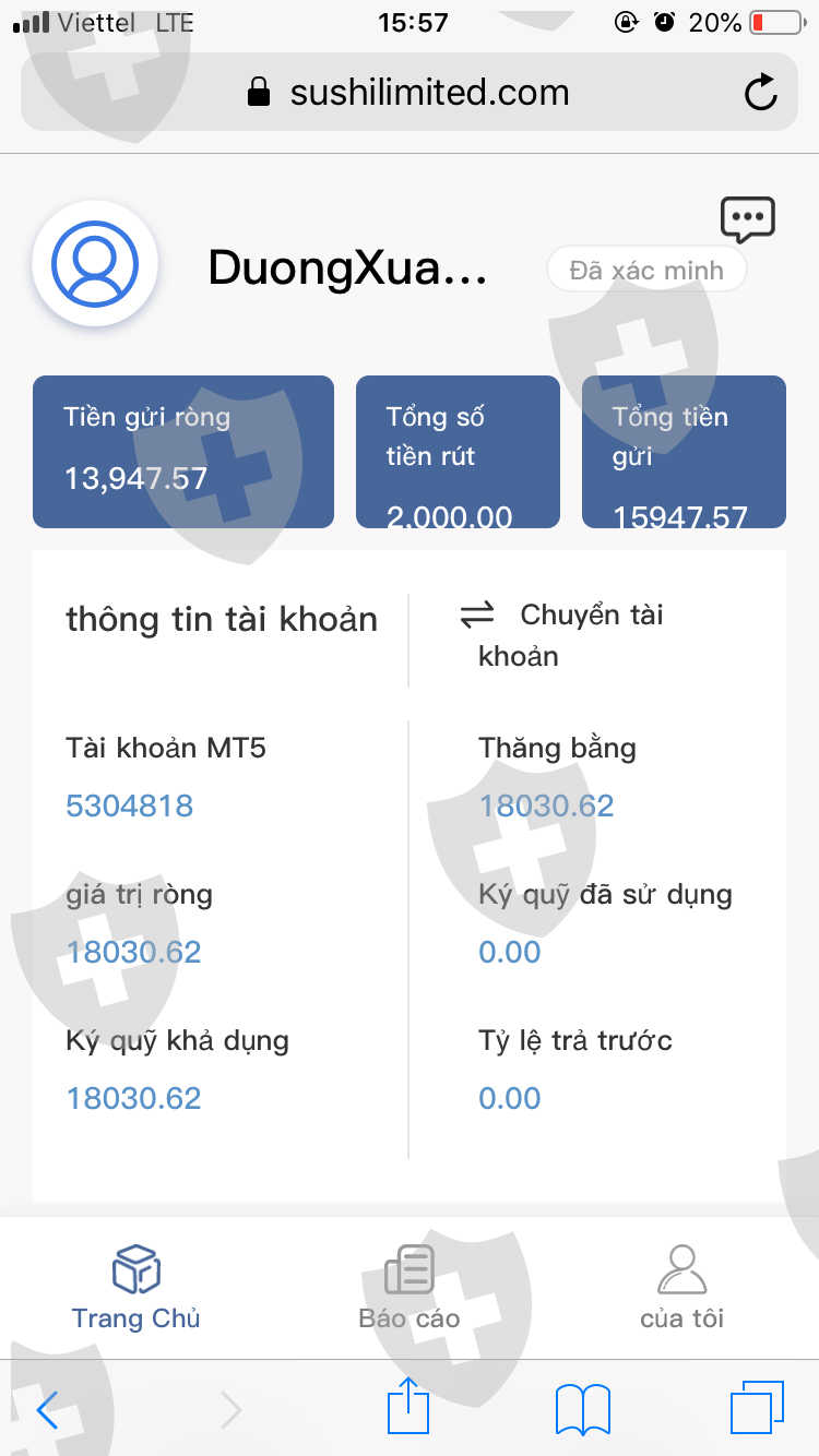 tôi có lập tài khoản sàn sushi global investing giao dịch trên mt5. đến khi rút tiền mình liên hệ chăm sóc khách hàng họ yêu cầu nộp 20% thuế trên tổng số tiền trong tài khoản( bao gồm cả lãi và lợi nhuận) nhận thấy không minh bạch và có dấu hiệu chiếm đoạt tài sản tôi không đồng ý.