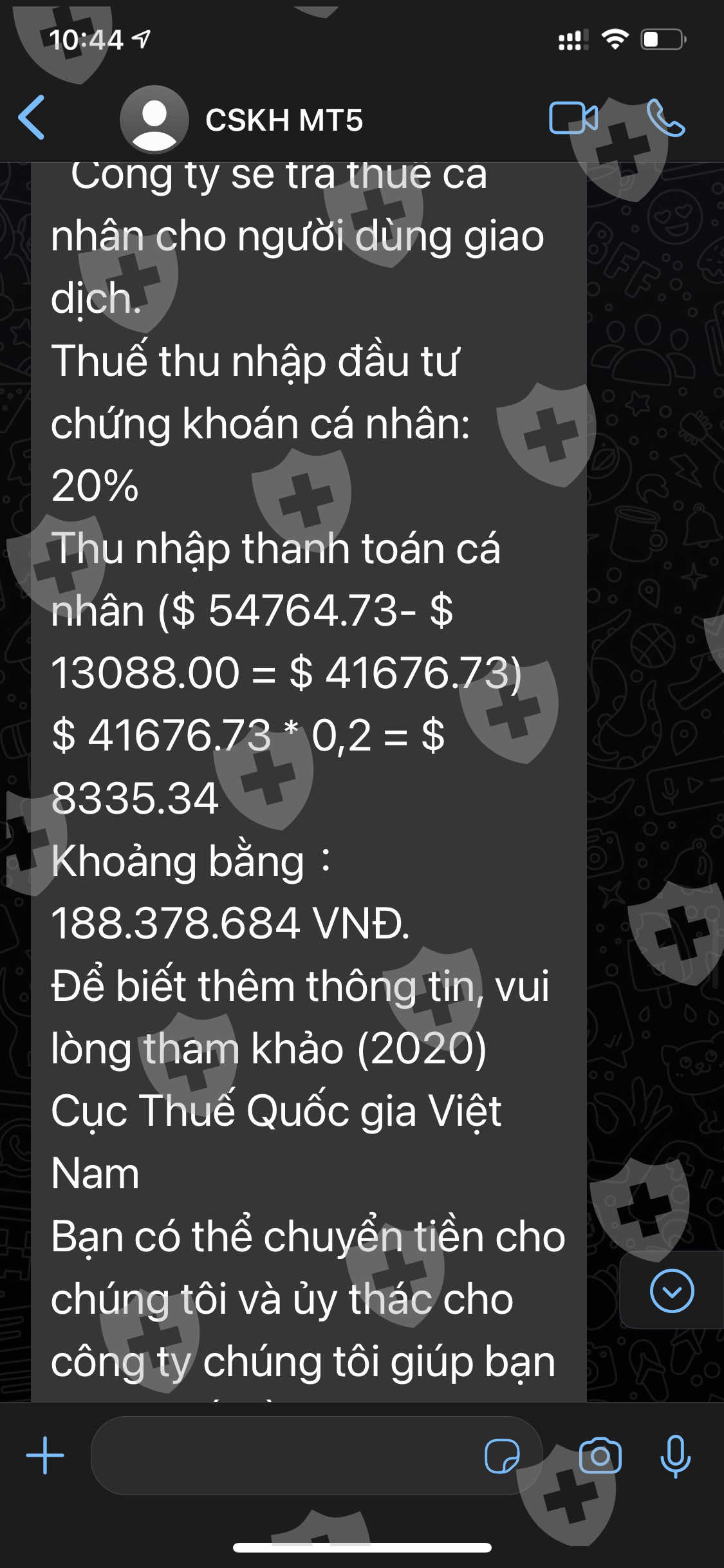 Tôi có mở một tài khoản trên SUSHI GLOBAL INVESTING Limited giao dịch trên nền tảng MT5 số tài khoản 5305843.Và tôi bị nhân viên cskh có số điện thoại +44 7587 476042 lừa đóng các khoản thuế thu nhập cá nhân 20% trên lợi nhuân, sau khi đóng thuế thì nhân viên cskh tiếp tục email cho tôi đóng tiếp 18% phí giải băng tài khoản. sau khi đón tất cả các khoản yêu cầu nhưng tôi vẫn không nhận được tiền từ SUSHI GLOBAL INVESTING Limited.